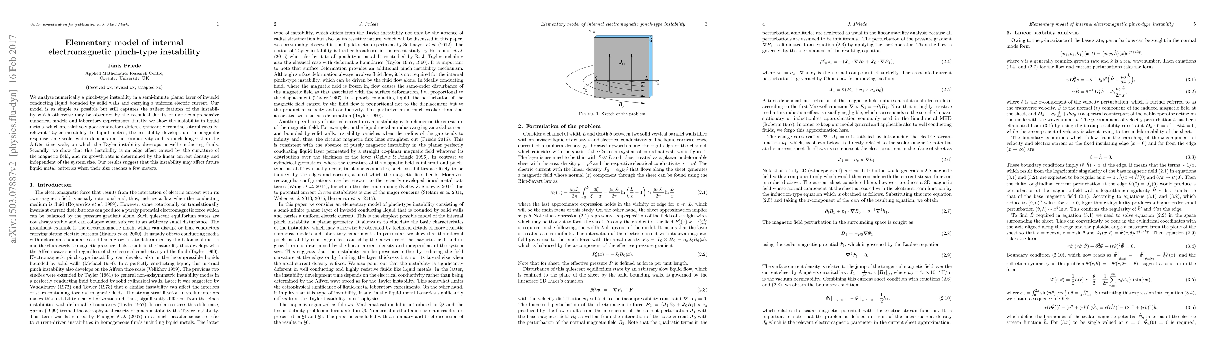 We analyse numerically a pinch-type instability in a semi-infinite planar layer of inviscid conducting liquid bounded by solid walls and carrying a uniform electric current. Our model is as simple as possible but still captures the salient features of the instability which otherwise may be obscured by the technical details of more comprehensive numerical models and laboratory experiments. Firstly, we show the instability in liquid metals, which are relatively poor conductors, differs significantly from the astrophysically-relevant Tayler instability. In liquid metals, the instability develops on the magnetic response time scale, which depends on the conductivity and is much longer than the Alfv\'en time scale, on which the Tayler instability develops in well conducting fluids. Secondly, we show that this instability is an edge effect caused by the curvature of the magnetic field, and its growth rate is determined by the linear current density and independent of the system size. Our results suggest that this instability may affect future liquid metal batteries when their size reaches a few meters.