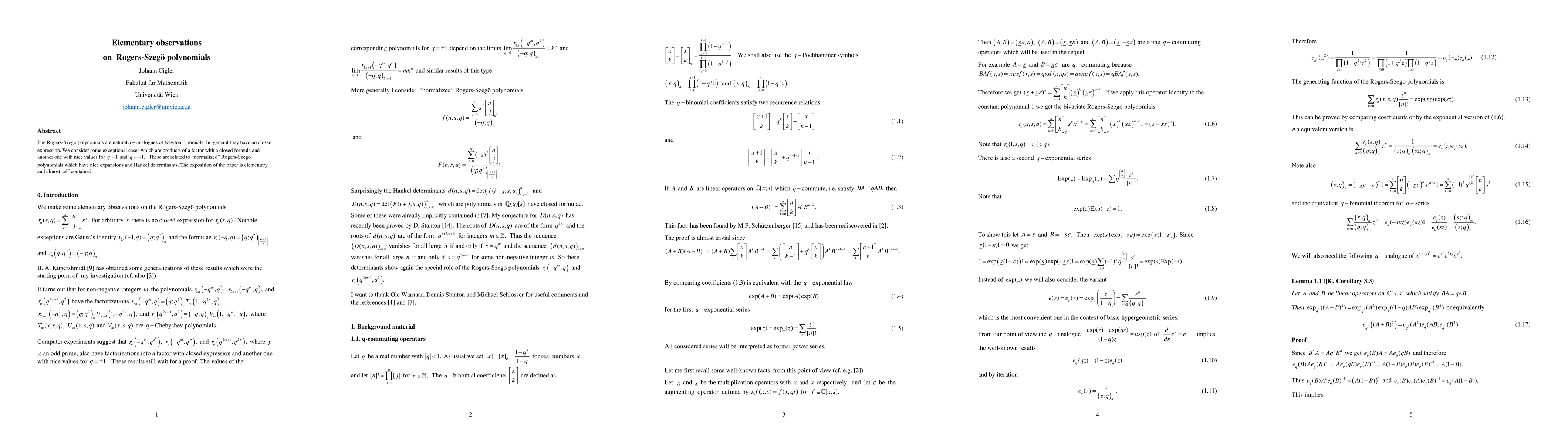 The Rogers-Szeg\"o polynomials are natural q-analogues of Newton binomials. In general they have no closed expression. We consider some exceptional cases which are products of a factor with a closed formula and another one with nice values for q=1 and q=-1. These are related to normalized Rogers-Szeg\"o polynomials which have nice expansions and Hankel determinants. The Exposition of the paper is elementary and almost self-contained.