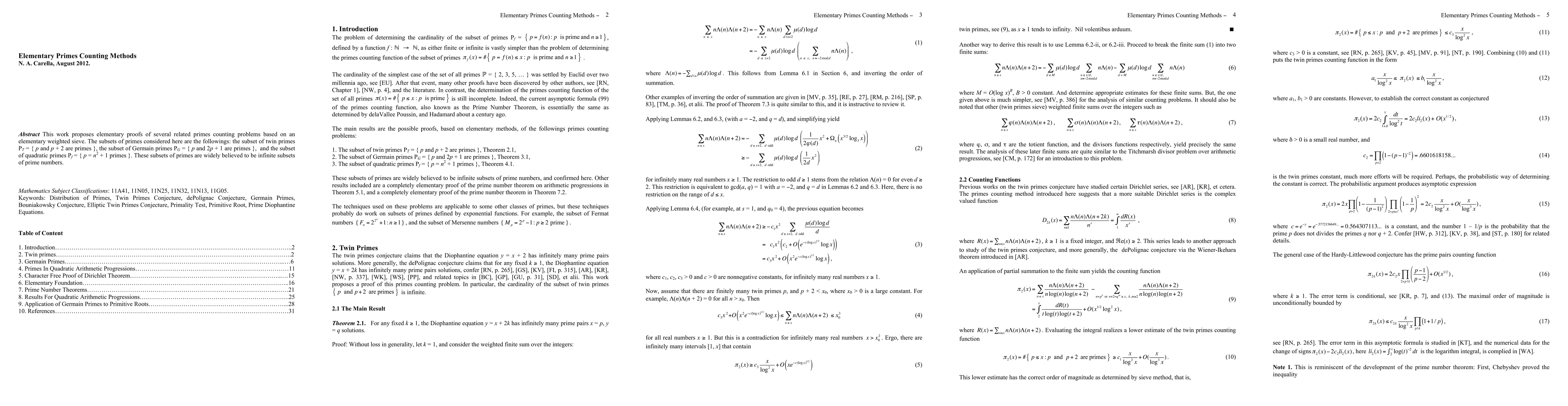 This work proposes elementary proofs of several related primes counting problems, based on an elementary weighted sieve. The subsets of primes considered here are the followings: the subset of twin primes PT = {p and p + 2 are primes}, the subset of Germain primes PG = {p and 2p + 1 are primes}, and the subset of quadratic primes Pf = {p = n^2 + 1 primes}. These subsets of primes are widely believed to be infinite subsets of prime numbers.