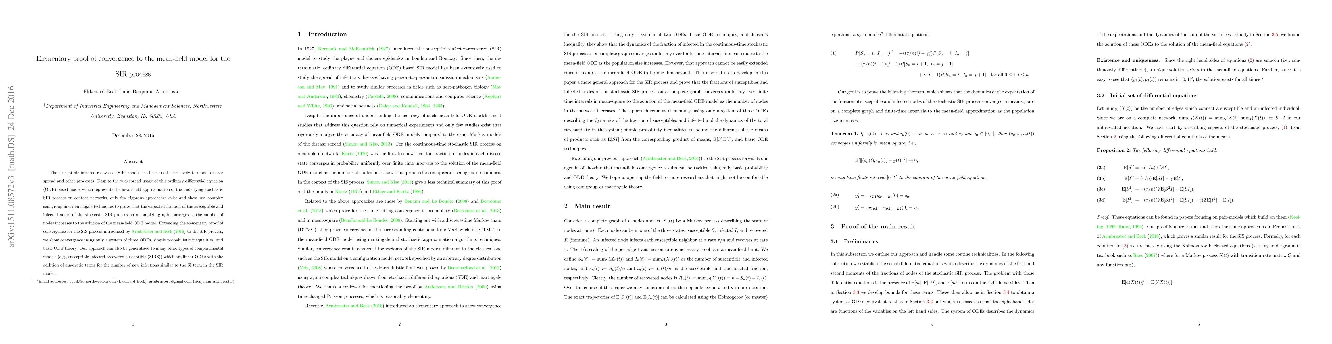 This paper presents a simplified proof for the convergence of the stochastic SIR disease spread model to its mean-field ODE approximation as the number of nodes grows. Utilizing a system of three ODEs, simple probabilistic inequalities, and basic ODE theory, the authors avoid complex semigroup and martingale techniques. The method can be extended to other compartmental models like SIRS, demonstrating broad applicability.