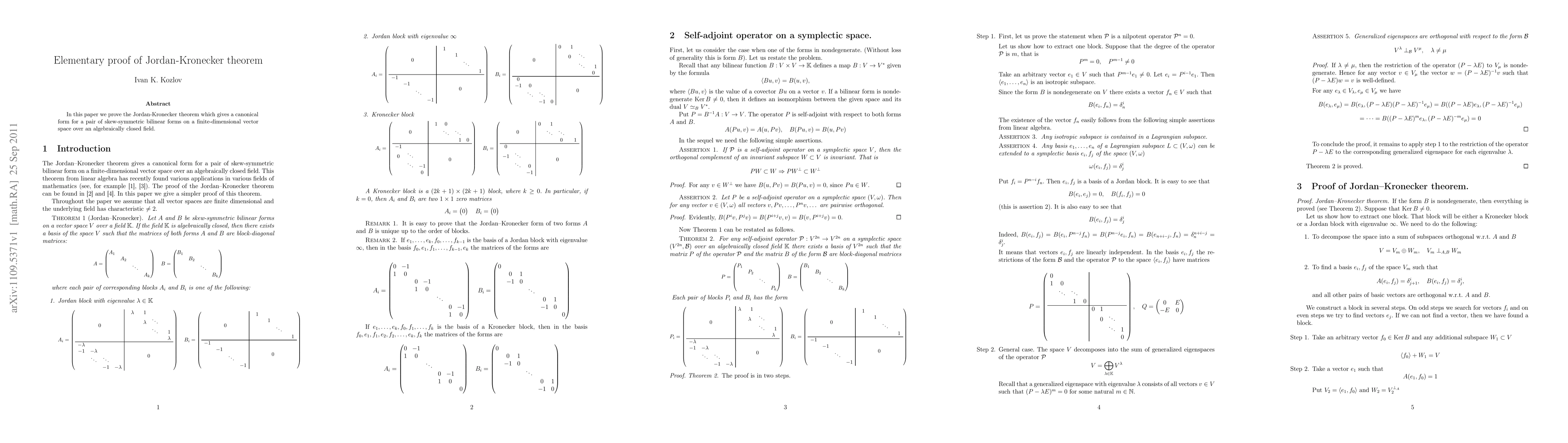Summary: This paper presents an elementary proof of the Jordan-Kronecker theorem, establishing a canonical form for a pair of skew-symmetric bilinear forms on a finite-dimensional vector space over an algebraically closed field. The proof is straightforward and accessible.