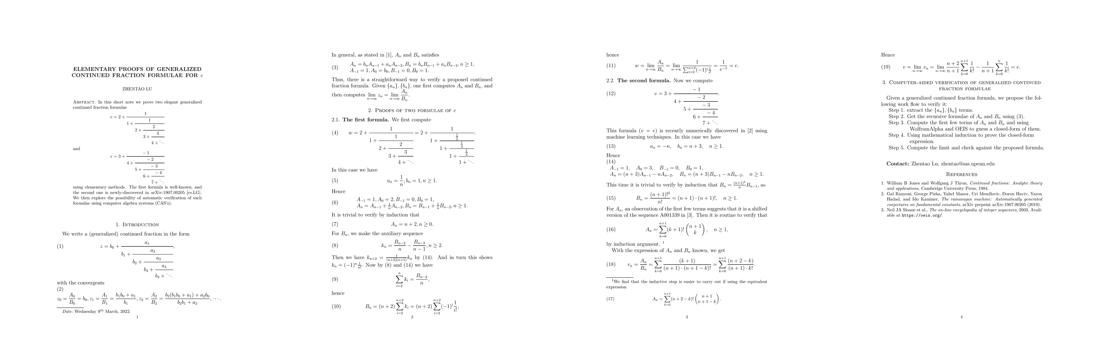 In this short note we prove two elegant generalized continued fraction formulae $$e= 2+\cfrac{1}{1+\cfrac{1}{2+\cfrac{2}{3+\cfrac{3}{4+\ddots}}}}$$ and $$e= 3+\cfrac{-1}{4+\cfrac{-2}{5+\cfrac{-3}{6+\cfrac{-4}{7+\ddots}}}}$$ using elementary methods. The first formula is well-known, and the second one is newly-discovered in arXiv:1907.00205 [cs.LG]. We then explore the possibility of automatic verification of such formulae using computer algebra systems (CAS's).