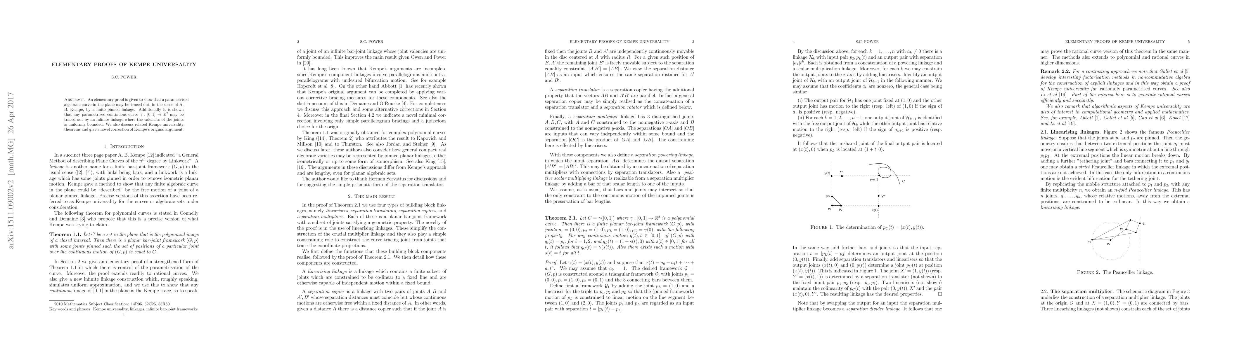 An elementary proof is given to show that a parametrised algebraic curve in the plane may be traced out, in the sense of A. B. Kempe, by a finite pinned linkage. Additionally it is shown that any parametrised continuous curve \gamma: [0,1] to R^2 may be traced out by an infinite linkage where the valencies of the joints is uniformly bounded. We also discuss related Kempe universality theorems and give a novel correction of Kempe's original argument.
