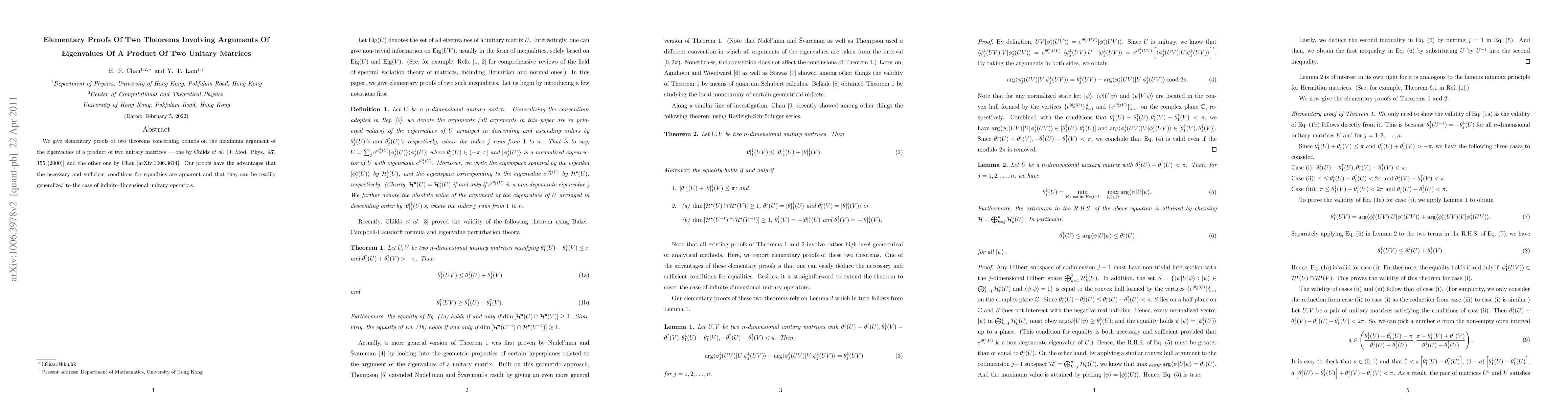 We give elementary proofs of two theorems concerning bounds on the maximum argument of the eigenvalues of a product of two unitary matrices --- one by Childs \emph{et al.} [J. Mod. Phys., \textbf{47}, 155 (2000)] and the other one by Chau [arXiv:1006.3614]. Our proofs have the advantages that the necessary and sufficient conditions for equalities are apparent and that they can be readily generalized to the case of infinite-dimensional unitary operators.
