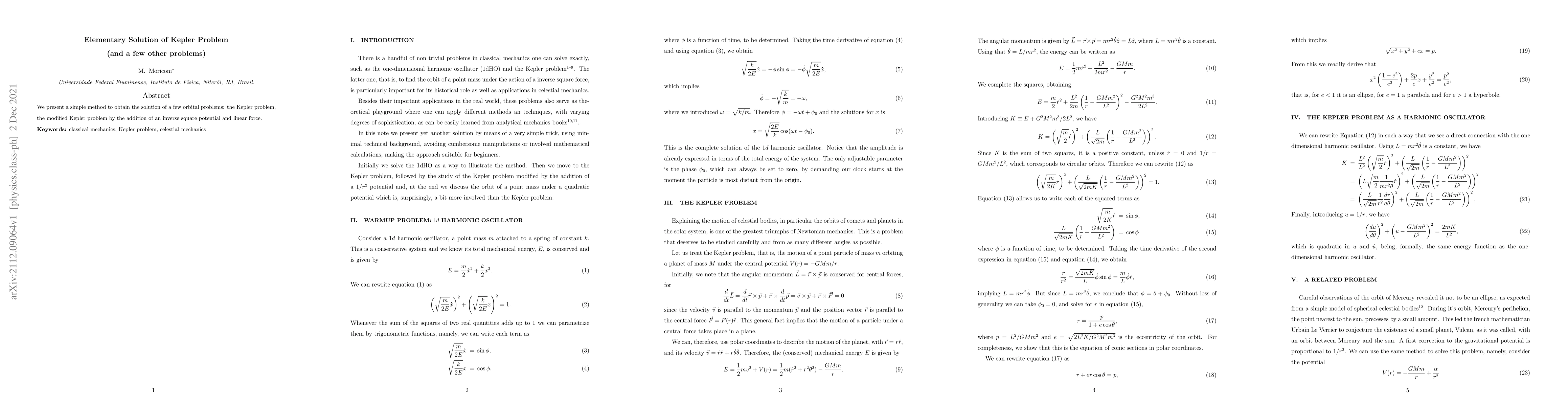 We present a simple method to obtain the solution of a few orbital problems: the Kepler problem, the modified Kepler problem by the addition of an inverse square potential and linear force.
