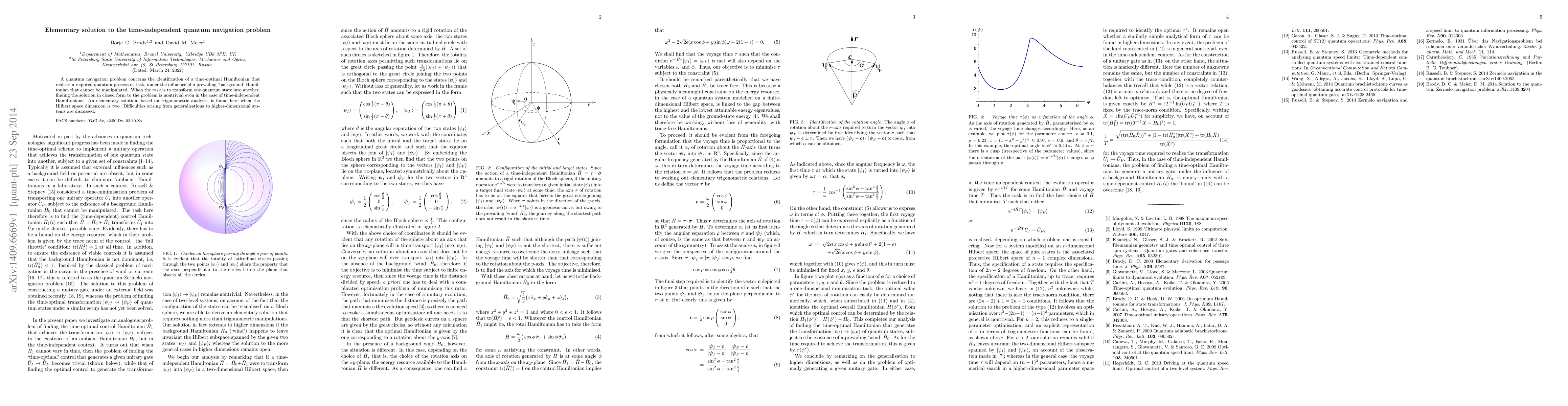 A quantum navigation problem concerns the identification of a time-optimal Hamiltonian that realises a required quantum process or task, under the influence of a prevailing `background' Hamiltonian that cannot be manipulated. When the task is to transform one quantum state into another, finding the solution in closed form to the problem is nontrivial even in the case of time-independent Hamiltonians. An elementary solution, based on trigonometric analysis, is found here when the Hilbert space dimension is two. Difficulties arising from generalisations to higher-dimensional systems are discussed.