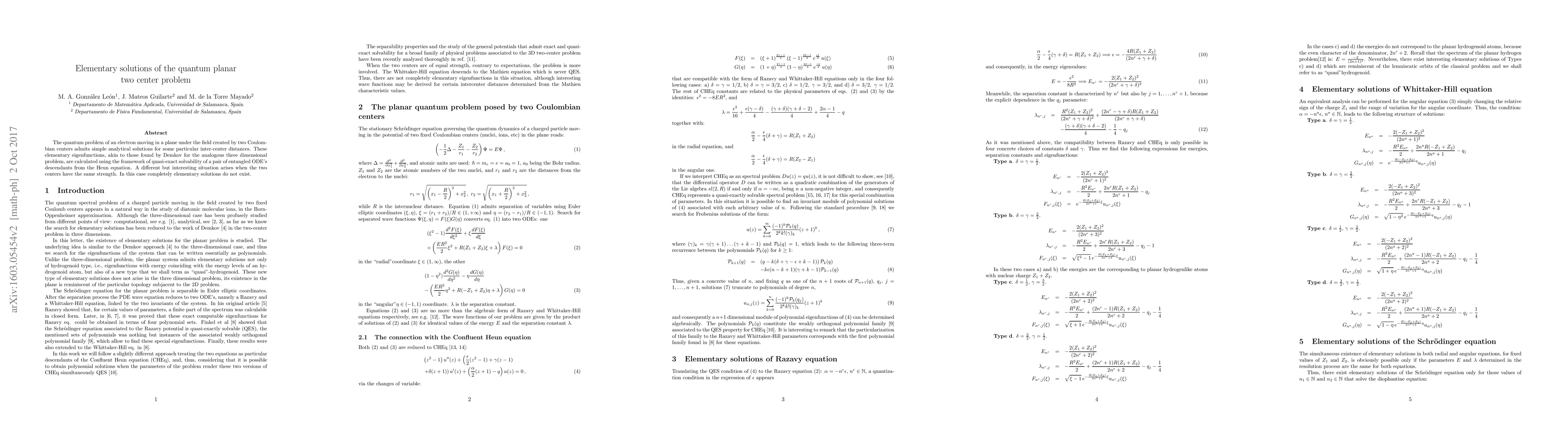 The quantum problem of an electron moving in a plane under the field created by two Coulombian centers admits simple analytical solutions for some particular inter-center distances. These elementary eigenfunctions, akin to those found by Demkov for the analogous three dimensional problem, are calculated using the framework of quasi-exact solvability of a pair of entangled ODE's descendants from the Heun equation. A different but interesting situation arises when the two centers have the same strength. In this case completely elementary solutions do not exist.