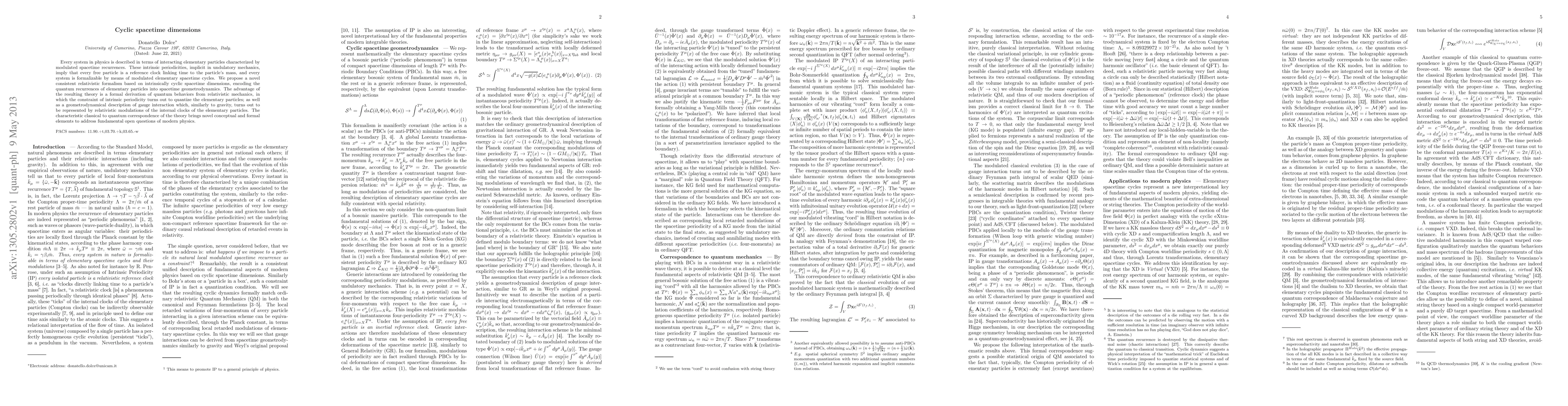 Every system in physics is described in terms of interacting elementary particles characterized by modulated spacetime recurrences. These intrinsic periodicities, implicit in undulatory mechanics, imply that every free particle is a reference clock linking time to the particle's mass, and every system is formalizable by means of modulated elementary spacetime cycles. We propose a novel consistent relativistic formalism based on intrinsically cyclic spacetime dimensions, encoding the quantum recurrences of elementary particles into spacetime geometrodynamics. The advantage of the resulting theory is a formal derivation of quantum behaviors from relativistic mechanics, in which the constraint of intrinsic periodicity turns out to quantize the elementary particles; as well as a geometrodynamical description of gauge interaction which, similarly to gravity, turns out to be represented by relativistic modulations of the internal clocks of the elementary particles. The characteristic classical to quantum correspondence of the theory brings novel conceptual and formal elements to address fundamental open questions of modern physics.