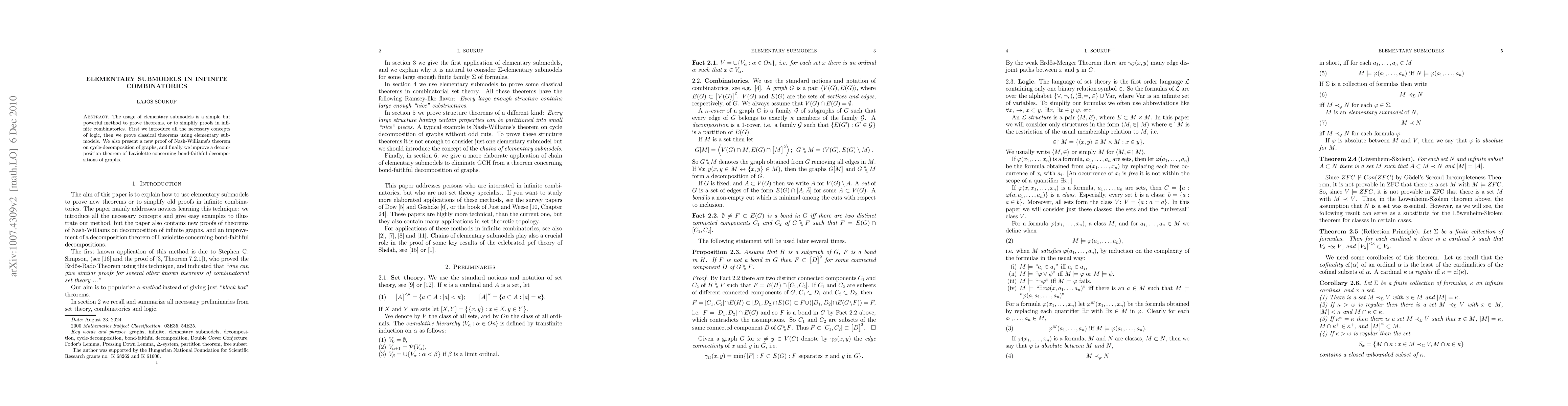 This paper explores the application of elementary submodels in infinite combinatorics to simplify proofs and demonstrate theorems. It introduces relevant logical concepts, presents a new proof for Nash-Williams's cycle-decomposition theorem, and enhances Laviolette's decomposition theorem on bond-faithful decompositions.