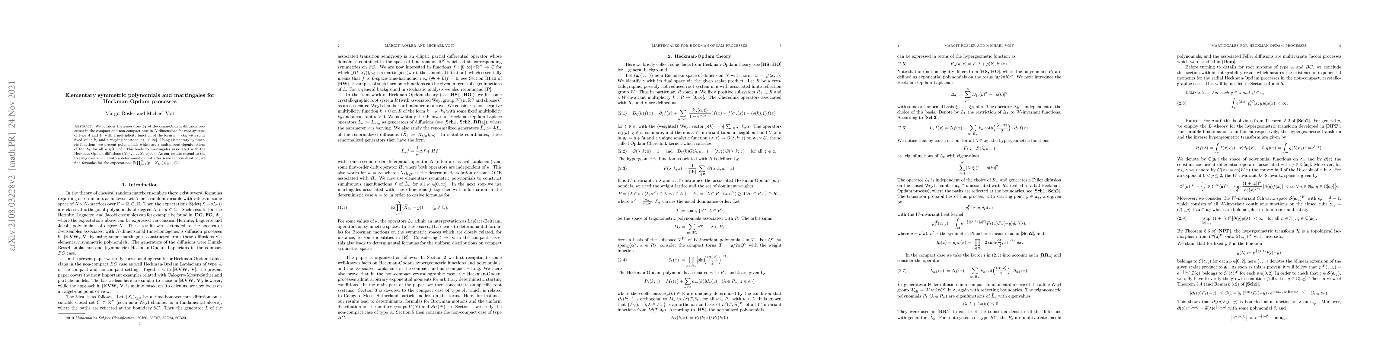 The paper utilizes elementary symmetric polynomials to derive martingales for Heckman-Opdam diffusion processes in both compact and non-compact cases for root systems of type A and B, extending to the freezing case with a deterministic limit.