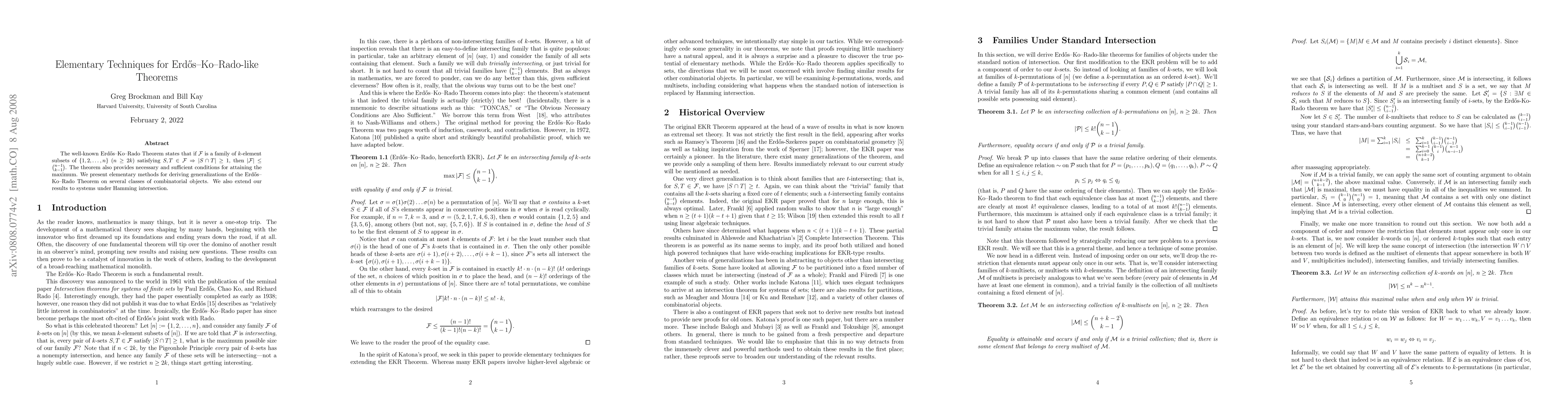 The paper employs elementary techniques, primarily probabilistic methods and reduction to known results, to derive generalizations of the Erdos-Ko-Rado theorem for various combinatorial objects, including k-permutations, k-multisets, and k-words.