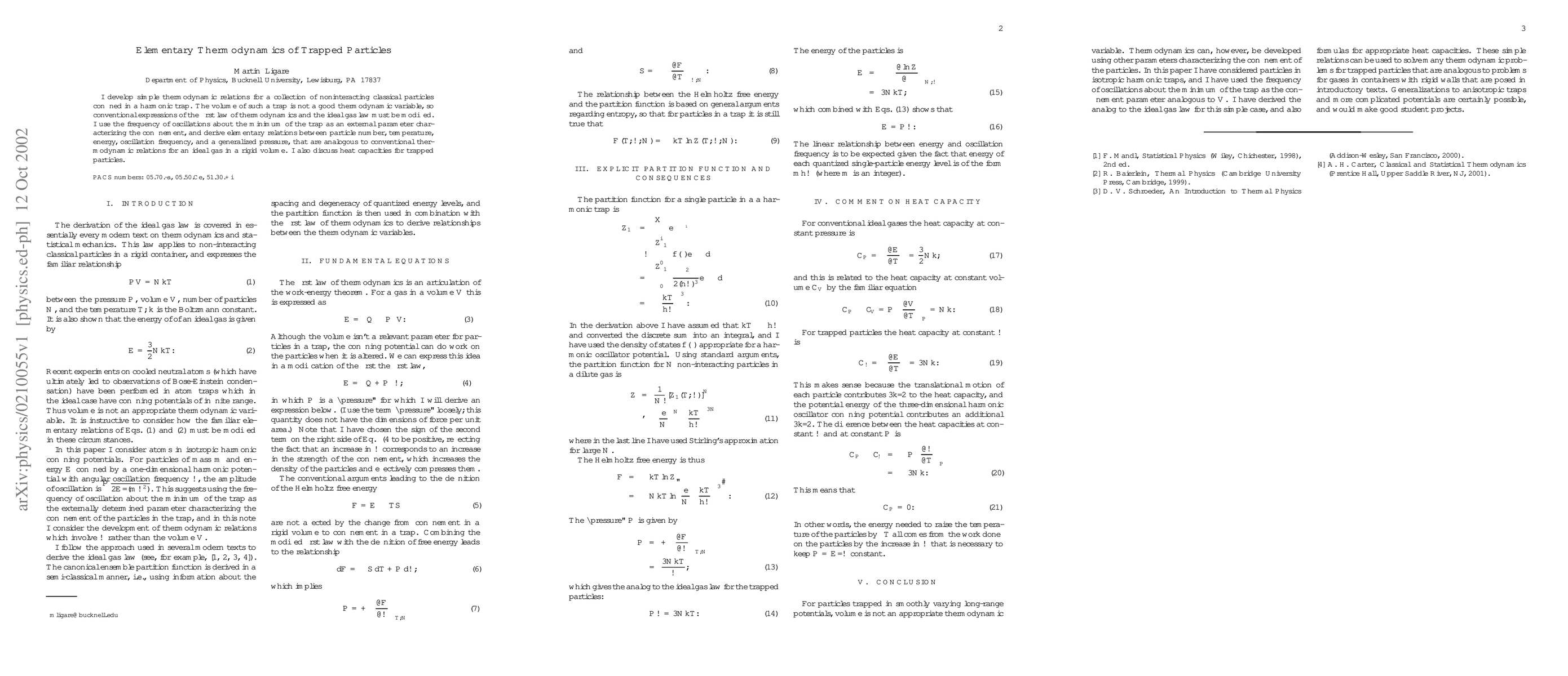 Researchers developed simple thermodynamic relations for particles trapped in a harmonic potential, creating new expressions that relate particle number, temperature, energy, and oscillation frequency, analogous to ideal gas laws in rigid volumes.