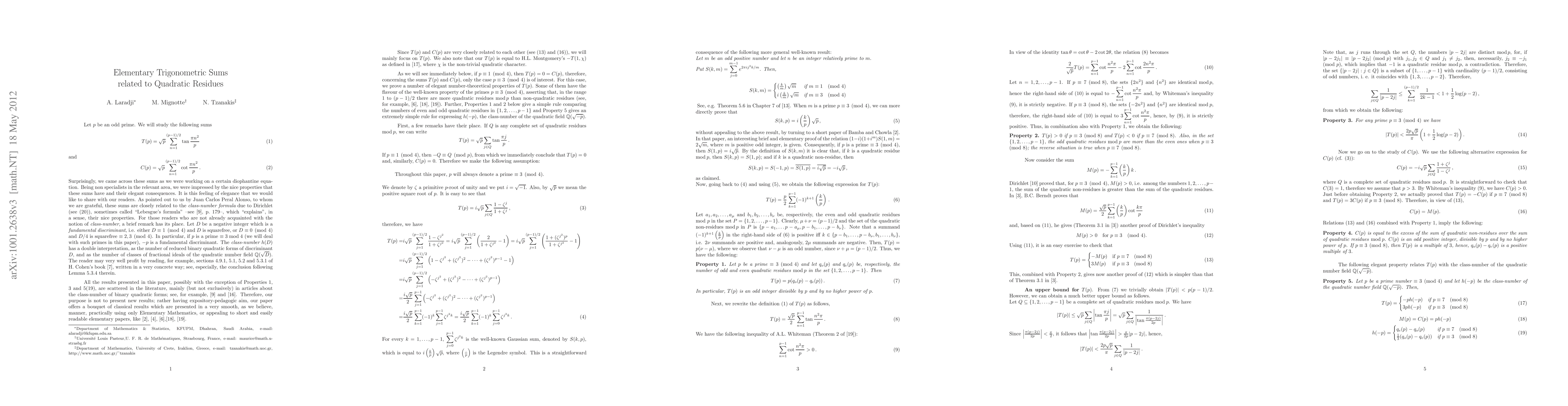 Let p be a prime = 3 (mod 4). A number of elegant number-theoretical properties of the sums T(p) = \sqrt{p}sum_{n=1}^{(p-1)/2} tan(n^2\pi/p) and C(p) = \sqrt{p}sum_{n=1}^{(p-1)/2} cot(n^2\pi/p) are proved. For example, T(p) equals p times the excess of the odd quadratic residues over the even ones in the set {1,2,...,p-1}; this number is positive if p = 3 (mod 8) and negative if p = 7 (mod 8). In this revised version the connection of these sums with the class-number h(-p) is also discussed. For example, a very simple formula expressing h(-p) by means of the aforementioned excess is proved. The bibliography has been considerably enriched. This article is of an expository nature.