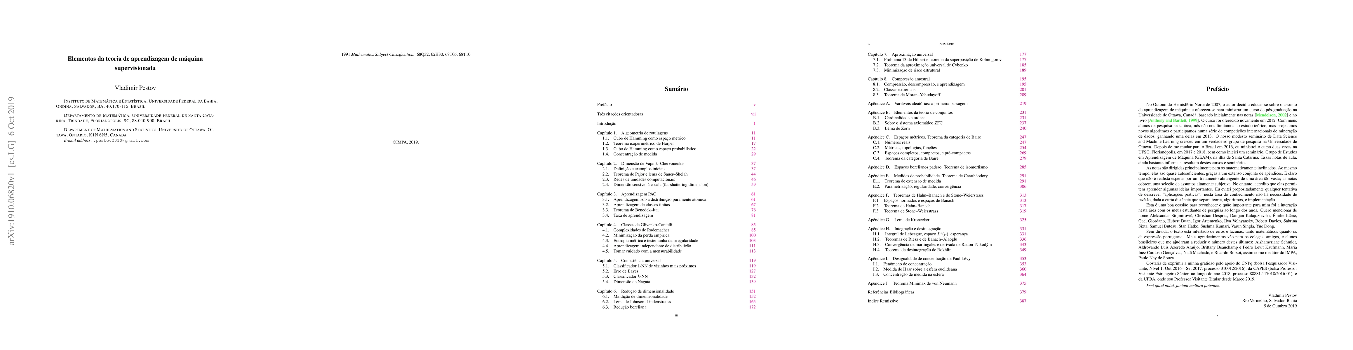 This is a set of lecture notes for an introductory course (advanced undergaduates or the 1st graduate course) on foundations of supervised machine learning (in Portuguese). The topics include: the geometry of the Hamming cube, concentration of measure, shattering and VC dimension, Glivenko-Cantelli classes, PAC learnability, universal consistency and the k-NN classifier in metric spaces, dimensionality reduction, universal approximation, sample compression. There are appendices on metric and normed spaces, measure theory, etc., making the notes self-contained. Este \'e um conjunto de notas de aula para um curso introdut\'orio (curso de gradua\c{c}\~ao avan\c{c}ado ou o 1o curso de p\'os) sobre fundamentos da aprendizagem de m\'aquina supervisionada (em Portugu\^es). Os t\'opicos incluem: a geometria do cubo de Hamming, concentra\c{c}\~ao de medida, fragmenta\c{c}\~ao e dimens\~ao de Vapnik-Chervonenkis, classes de Glivenko-Cantelli, aprendizabilidade PAC, consist\^encia universal e o classificador k-NN em espa\c{c}os m\'etricos, redu\c{c}\~ao de dimensionalidade, aproxima\c{c}\~ao universal, compress\~ao amostral. H\'a ap\^endices sobre espa\c{c}os m\'etricos e normados, teoria de medida, etc., tornando as notas autosuficientes.