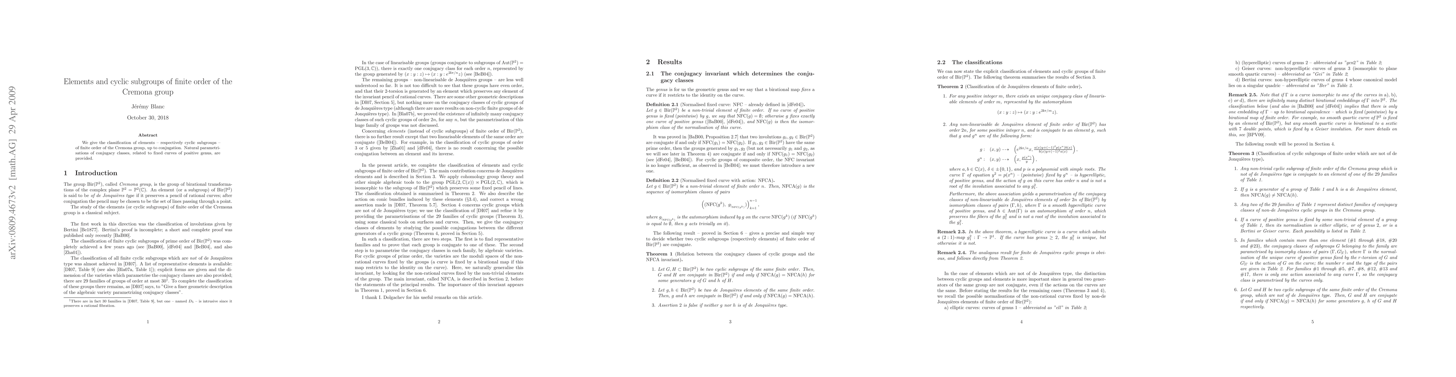 This paper classifies elements and cyclic subgroups of finite order in the Cremona group up to conjugation, providing natural parametrizations related to fixed curves of positive genus. The work elucidates the structure and behavior of these finite order elements within the broader context of birational transformations.