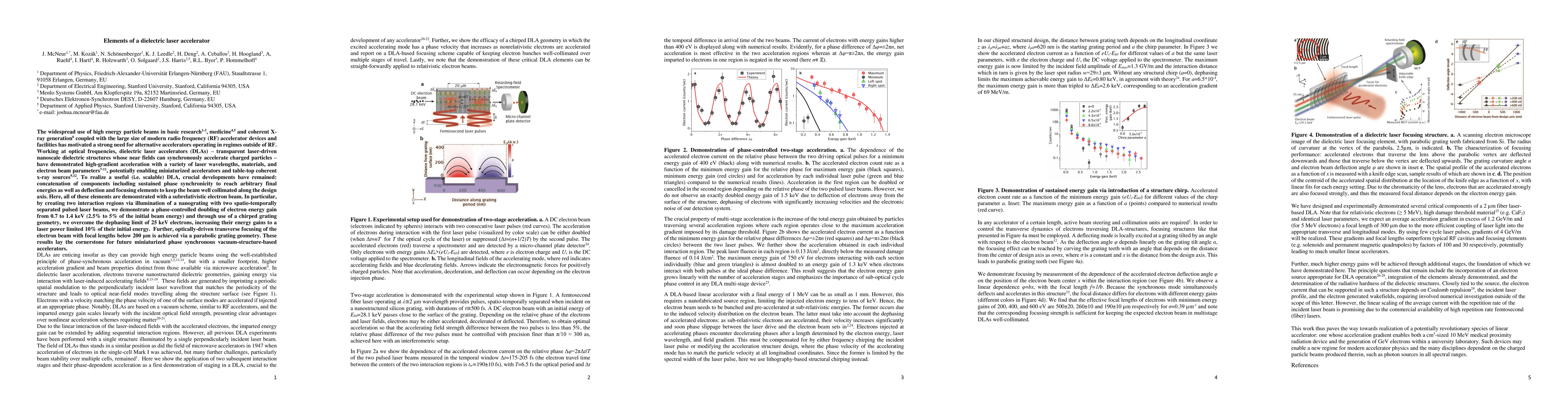 The widespread use of high energy particle beams in basic research, medicine and coherent X-ray generation coupled with the large size of modern radio frequency (RF) accelerator devices and facilities has motivated a strong need for alternative accelerators operating in regimes outside of RF. Working at optical frequencies, dielectric laser accelerators (DLAs) - transparent laser-driven nanoscale dielectric structures whose near fields can synchronously accelerate charged particles - have demonstrated high-gradient acceleration with a variety of laser wavelengths, materials, and electron beam parameters, potentially enabling miniaturized accelerators and table-top coherent x-ray sources. To realize a useful (i.e. scalable) DLA, crucial developments have remained: concatenation of components including sustained phase synchronicity to reach arbitrary final energies as well as deflection and focusing elements to keep the beam well collimated along the design axis. Here, all of these elements are demonstrated with a subrelativistic electron beam. In particular, by creating two interaction regions via illumination of a nanograting with two spatio-temporally separated pulsed laser beams, we demonstrate a phase-controlled doubling of electron energy gain from 0.7 to 1.4 keV (2.5 percent to 5 percent of the initial beam energy) and through use of a chirped grating geometry, we overcome the dephasing limit of 25 keV electrons, increasing their energy gains to a laser power limited 10 percent of their initial energy. Further, optically-driven transverse focusing of the electron beam with focal lengths below 200 microns is achieved via a parabolic grating geometry. These results lay the cornerstone for future miniaturized phase synchronous vacuum-structure-based accelerators.