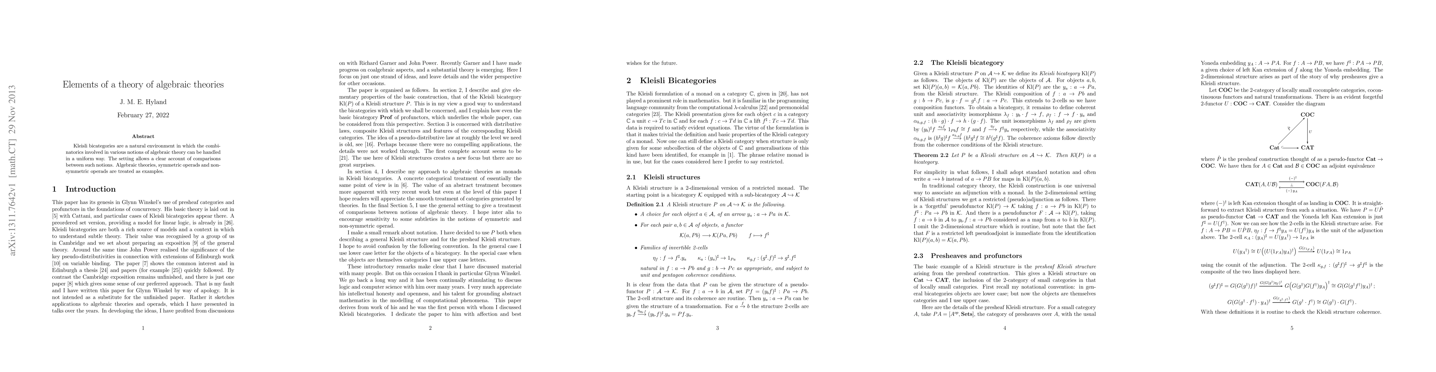 Kleisli bicategories are a natural environment in which the combinatorics involved in various notions of algebraic theory can be handled in a uniform way. The setting allows a clear account of comparisons between such notions. Algebraic theories, symmetric operads and nonsymmetric operads are treated as examples.