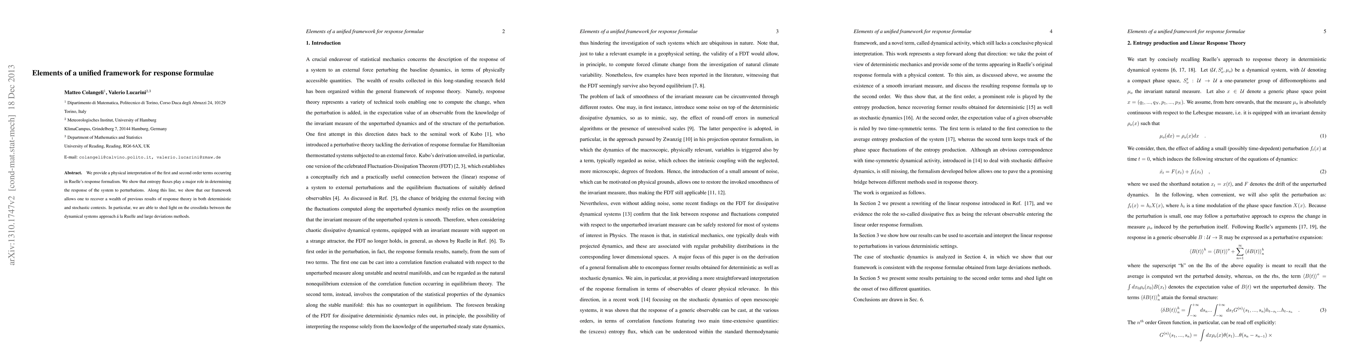 We provide a physical interpretation of the first and second order terms occurring in Ruelle's response formalism. We show that entropy fluxes play a major role in determining the response of the system to perturbations. Along this line, we show that our framework allows one to recover a wealth of previous results of response theory in both deterministic and stochastic contexts. In particular, we are able to shed light on the crosslinks between the dynamical systems approach \'{a} la Ruelle and large deviations methods.