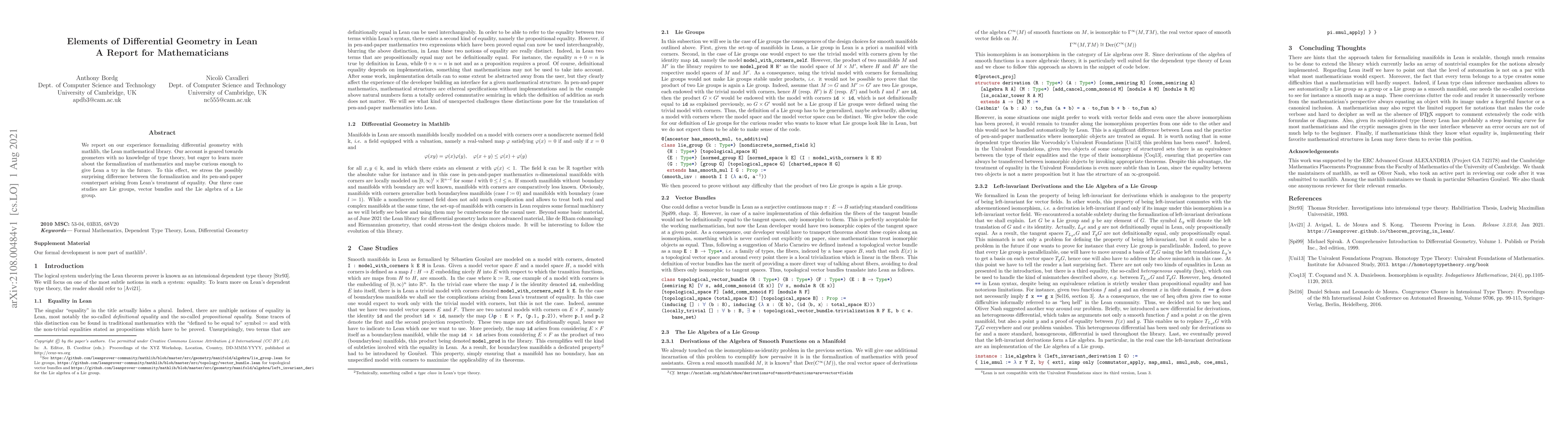 This paper details the formalization of differential geometry concepts within Lean's mathlib library, focusing on Lie groups, vector bundles, and Lie algebras. It aims to bridge the gap between traditional geometry and formalization, highlighting differences due to Lean's unique approach to equality.