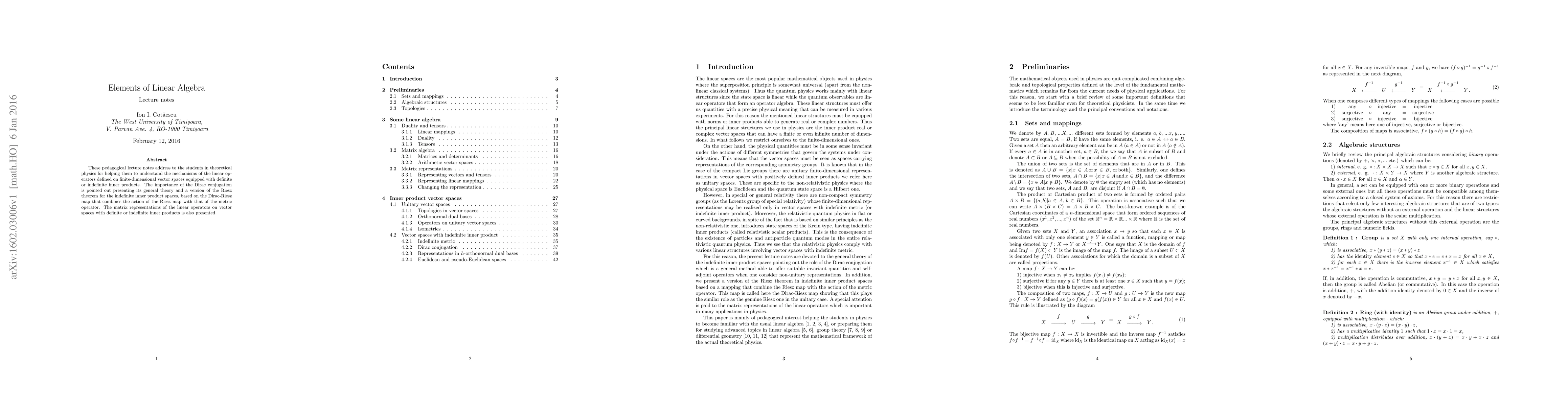 These lecture notes elucidate linear operators in finite-dimensional vector spaces, emphasizing Dirac conjugation and the Riesz theorem for indefinite inner products, alongside matrix representations of linear operators.
