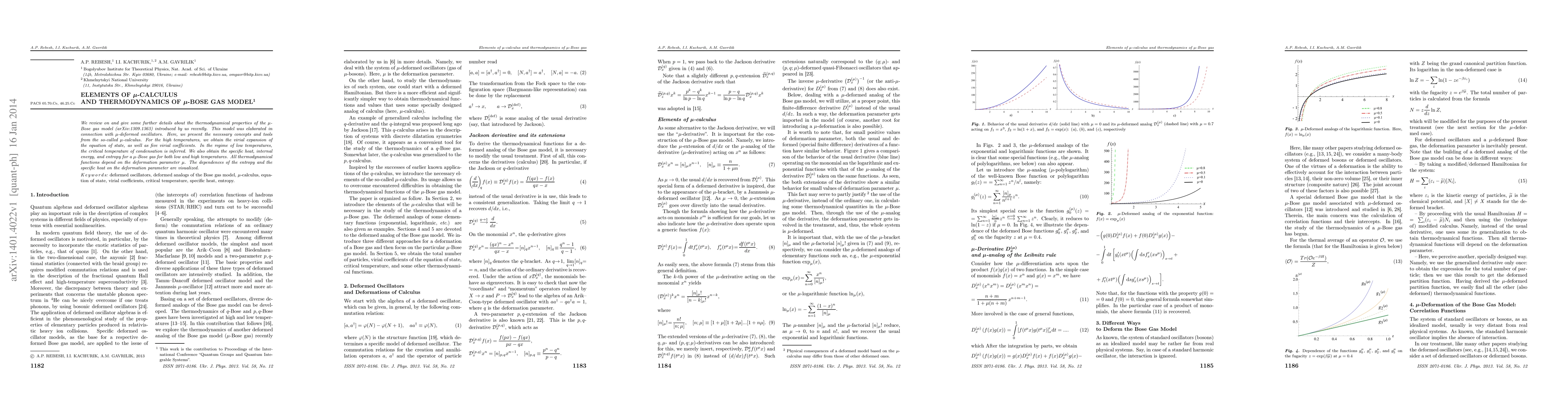 This paper reviews the thermodynamic properties of the $\mu$-Bose gas model, introducing $\mu$-calculus concepts and tools. It derives the virial expansion, critical temperature, and thermodynamic functions for both high and low temperatures, all dependent on the deformation parameter $\mu$. Visualizations of entropy and specific heat versus $\mu$ are provided.