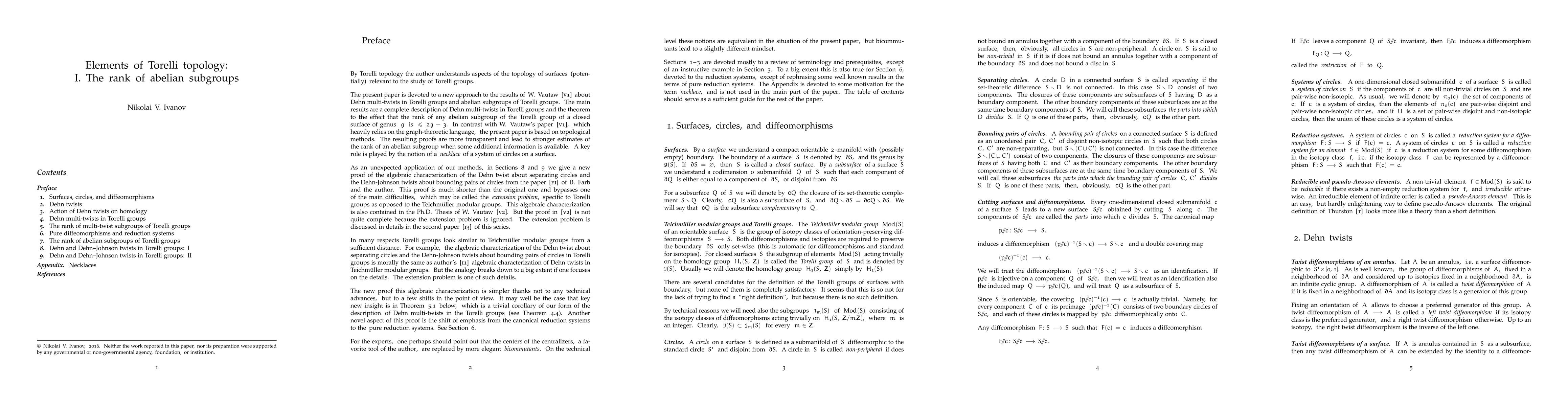 By Torelli topology the author understands aspects of the topology of surfaces (potentially) relevant to the study of Torelli groups. The present paper is devoted to a new approach to the results of W. Vautaw about Dehn multi-twists in Torelli groups and abelian subgroups of Torelli groups. The new proofs are more transparent and lead to stronger estimates of the rank of an abelian subgroup when some additional information is available. An unexpected application of our methods is a new proof of the algebraic characterization of the Dehn twist about separating circles and the Dehn-Johnson twists about bounding pairs of circles. This proof is much shorter than the original one and bypasses one of the main difficulties, which may be called the extension problem, specific to Torelli groups as opposed to the Teichm\"uller modular groups. The extension problem is discussed in details in the second paper of this series.
