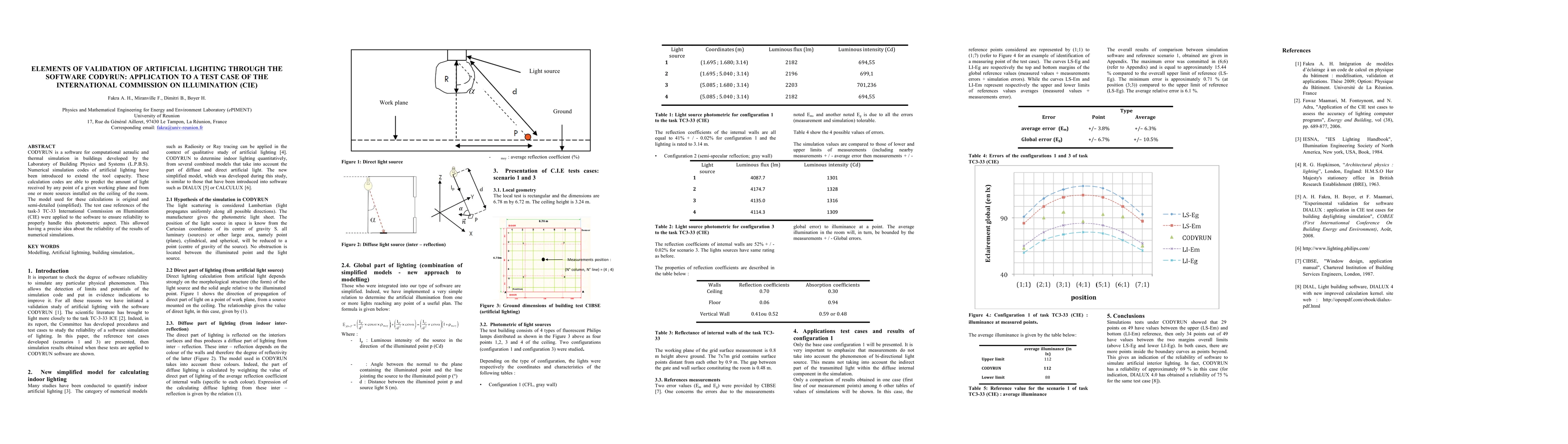 CODYRUN is a software for computational aeraulic and thermal simulation in buildings developed by the Laboratory of Building Physics and Systems (L.P.B.S). Numerical simulation codes of artificial lighting have been introduced to extend the tool capacity. These calculation codes are able to predict the amount of light received by any point of a given working plane and from one or more sources installed on the ceiling of the room. The model used for these calculations is original and semi-detailed (simplified). The test case references of the task-3 TC-33 International Commission on Illumination (CIE) were applied to the software to ensure reliability to properly handle this photometric aspect. This allowed having a precise idea about the reliability of the results of numerical simulations.