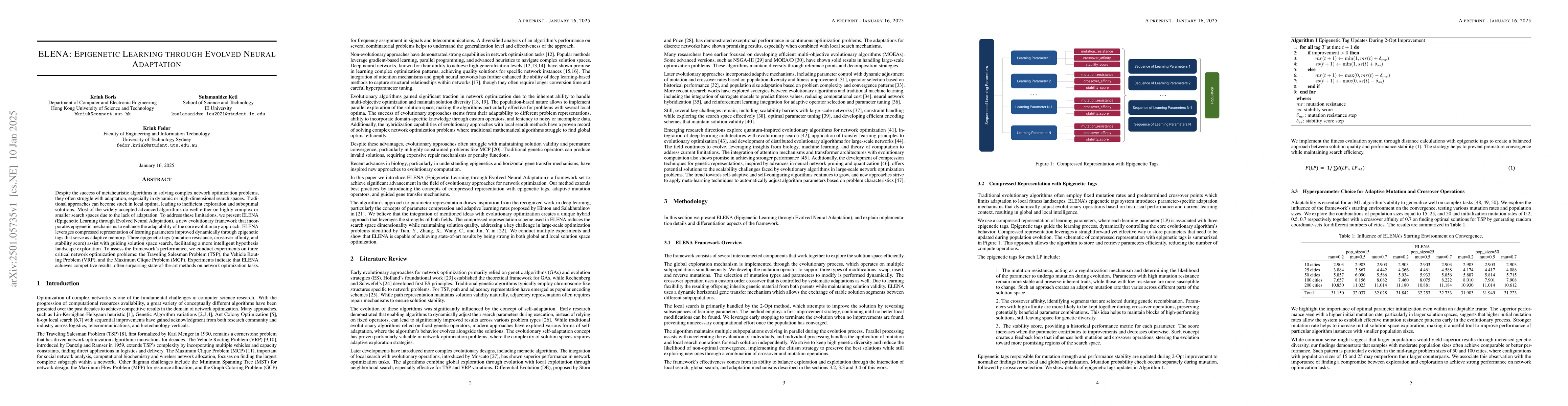 ELENA is a novel evolutionary framework that integrates epigenetic mechanisms to improve adaptability for complex network optimization problems. It uses dynamic epigenetic tags to guide search in solution spaces, achieving competitive results on the Traveling Salesman Problem, Vehicle Routing Problem, and Maximum Clique Problem.