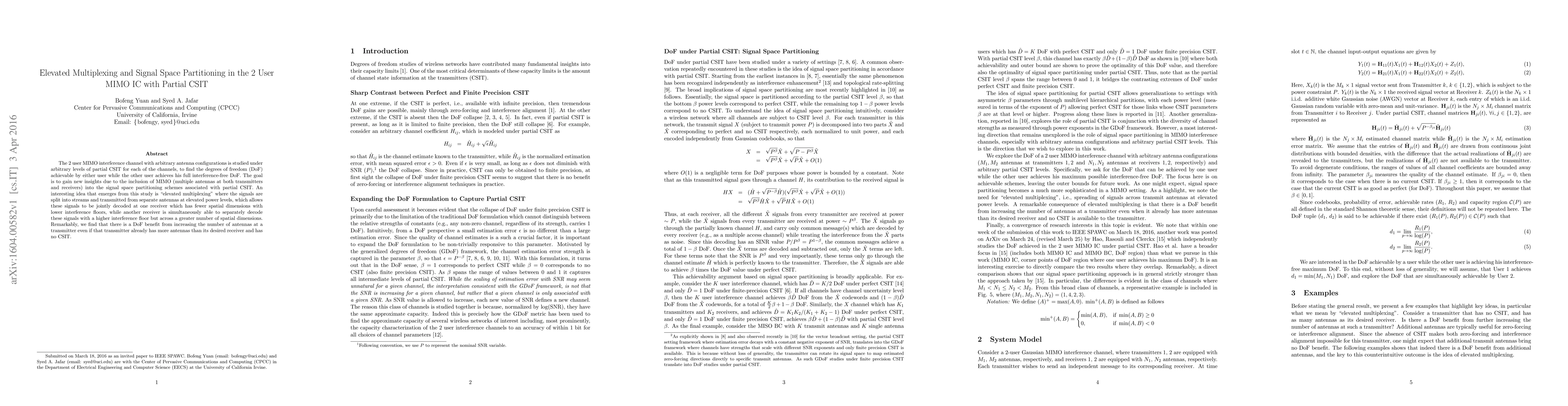 The $2$ user MIMO interference channel with arbitrary antenna configurations is studied under arbitrary levels of partial CSIT for each of the channels, to find the degrees of freedom (DoF) achievable by either user while the other user achieves his full interference-free DoF. The goal is to gain new insights due to the inclusion of MIMO (multiple antennas at both transmitters and receivers) into the signal space partitioning schemes associated with partial CSIT. An interesting idea that emerges from this study is "elevated multiplexing" where the signals are split into streams and transmitted from separate antennas at elevated power levels, which allows these signals to be jointly decoded at one receiver which has fewer spatial dimensions with lower interference floors, while another receiver is simultaneously able to separately decode these signals with a higher interference floor but across a greater number of spatial dimensions. Remarkably, we find that there is a DoF benefit from increasing the number of antennas at a transmitter even if that transmitter already has more antennas than its desired receiver and has no CSIT.
