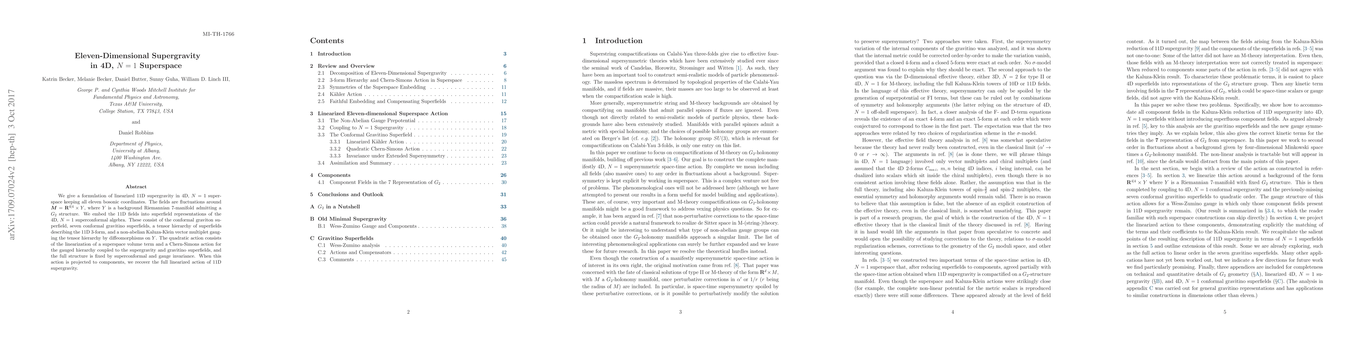 The paper presents a detailed formulation of 11D supergravity in 4D, $N=1$ superspace, including a comprehensive set of gauge transformations and a quadratic action that is invariant under these transformations.