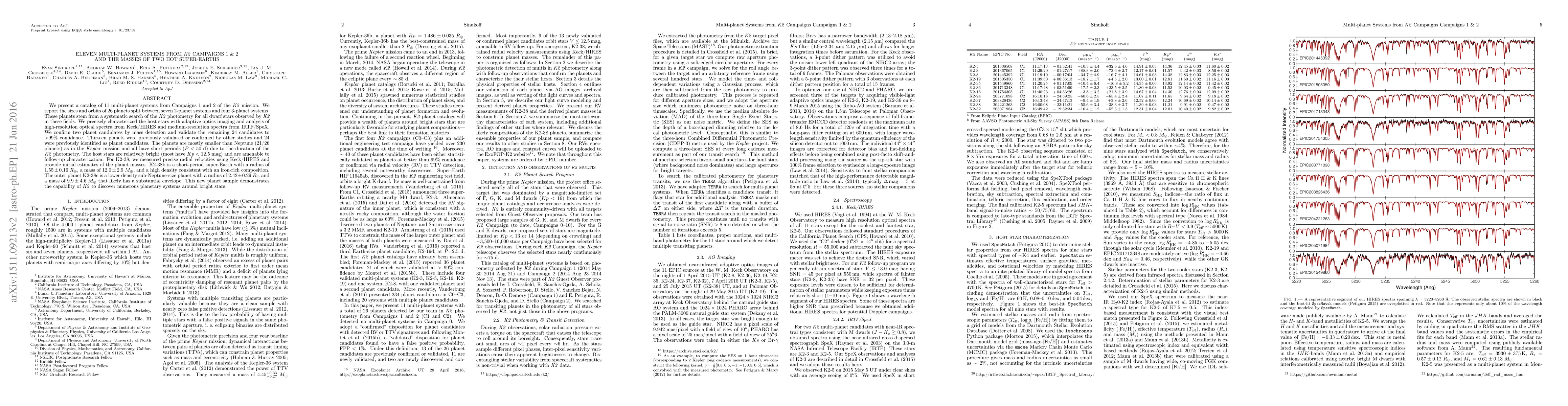 This paper reports 11 multi-planet systems from K2 Campaigns 1 and 2, including 26 planets mostly smaller than Neptune. The study confirms two super-Earths, K2-38b and K2-38c, with precise mass measurements, showcasing K2's ability to find planetary systems around bright stars.