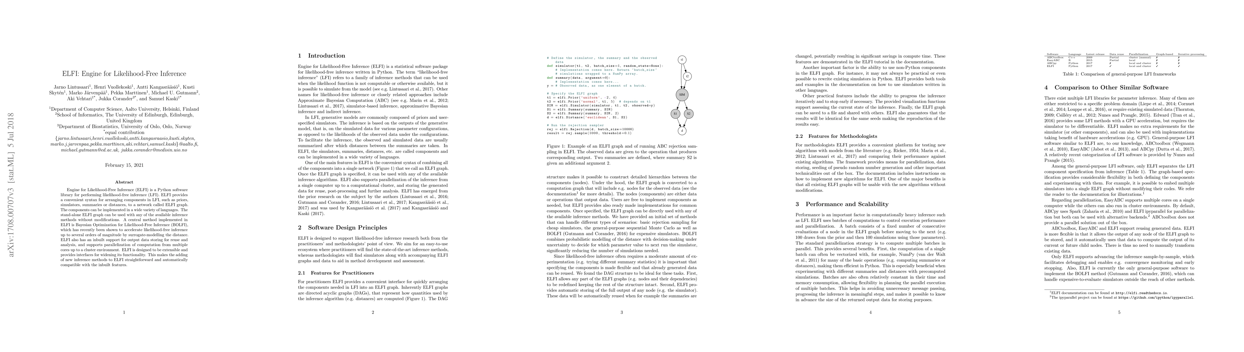 ELFI is a Python library for likelihood-free inference, facilitating the arrangement of components into an ELFI graph, and supporting parallel computation and Bayesian Optimization for Acceleration. It is extensible, allowing easy integration of new inference methods.