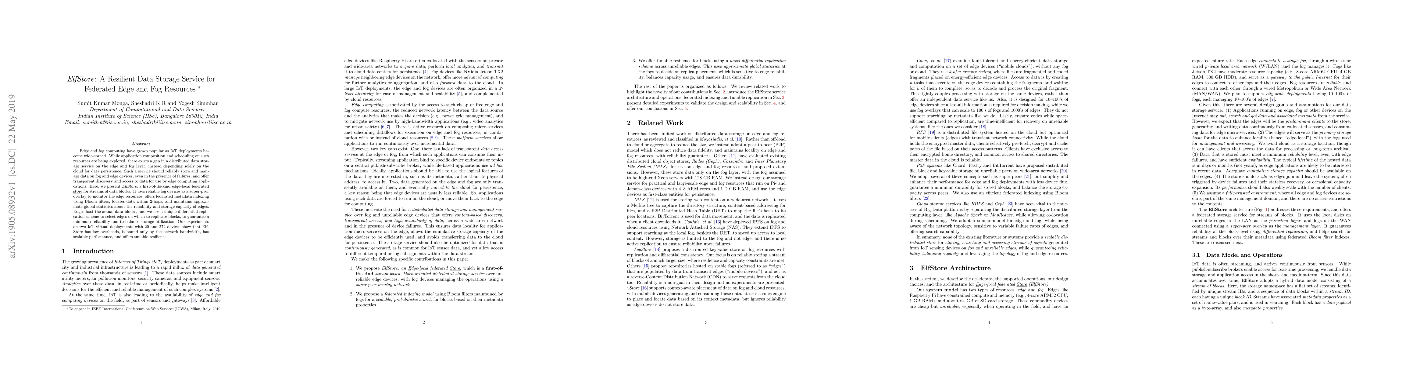 ElfStore is an innovative edge-local federated storage service designed to manage data on edge and fog devices, offering reliable data persistence and transparent data access. It employs a differential replication scheme to balance storage and ensure resilience, demonstrating low overhead and scalable performance in IoT deployments.