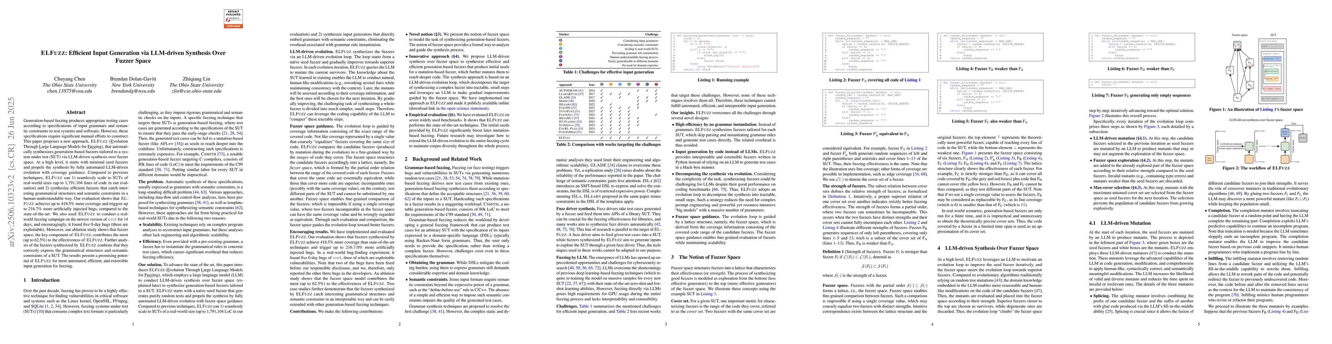 ELFuzz introduces the concept of 'fuzzer space' to structure fuzzers into a lattice for assessing their relative effectiveness, and uses LLM-driven evolution with fuzzer space guidance to synthesize fuzzers for automated, efficient, and interpretable input generation.