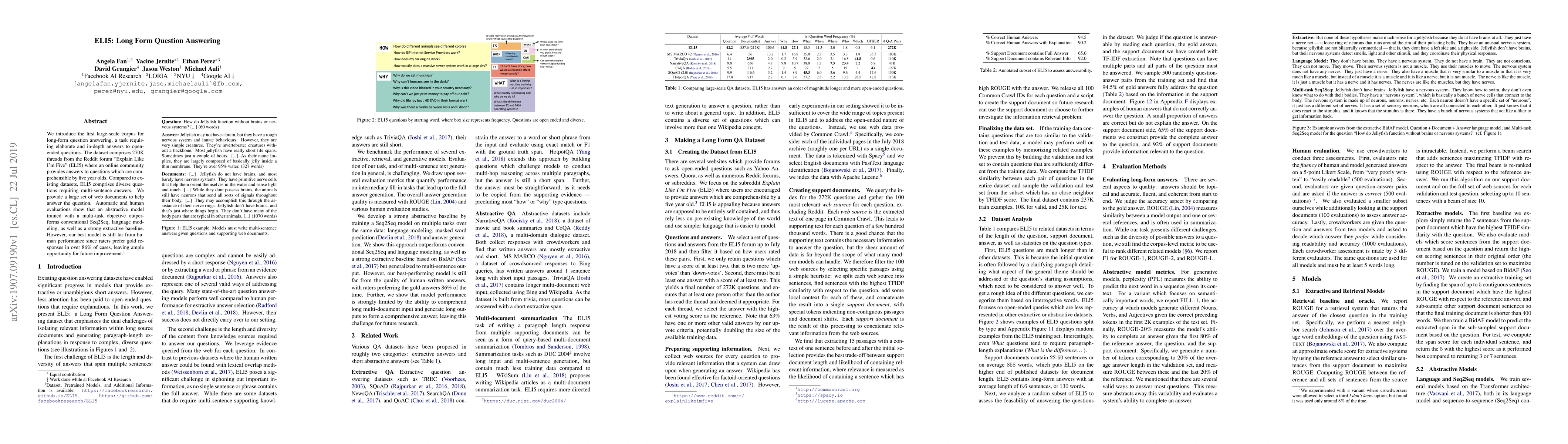 This paper introduces a large-scale dataset for long-form question answering based on Reddit's ELI5 forum, featuring 270K threads with multi-sentence answers. An abstractive model trained on this dataset outperforms traditional methods, though it still lags significantly behind human performance.