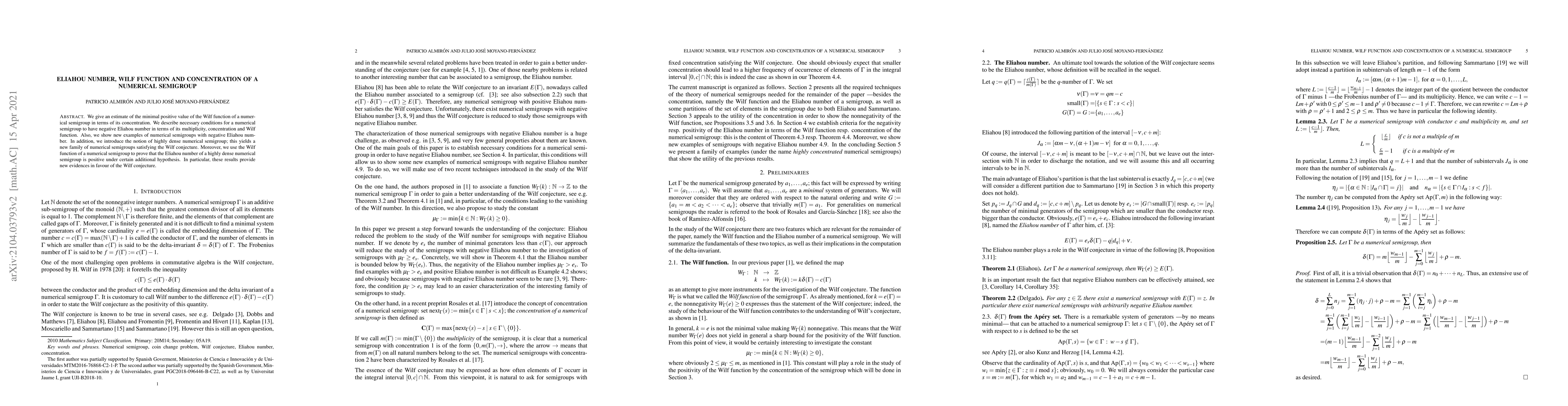 We give an estimate of the minimal positive value of the Wilf function of a numerical semigroup in terms of its concentration. We describe necessary conditions for a numerical semigroup to have negative Eliahou number in terms of its multiplicity, concentration and Wilf function. Also, we show new examples of numerical semigroups with negative Eliahou number. In addition, we introduce the notion of highly dense numerical semigroup; this yields a new family of numerical semigroups satisfying the Wilf conjecture. Moreover, we use the Wilf function of a numerical semigroup to prove that the Eliahou number of a highly dense numerical semigroup is positive under certain additional hypothesis. In particular, these results provide new evidences in favour of the Wilf conjecture.