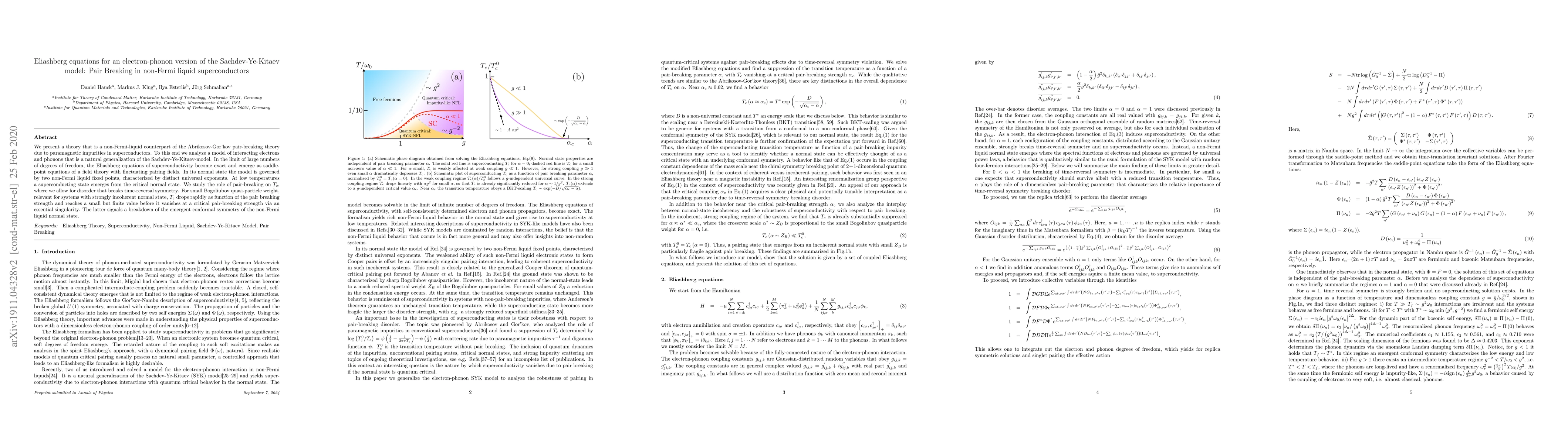 We present a theory that is a non-Fermi-liquid counterpart of the Abrikosov-Gor'kov pair-breaking theory due to paramagnetic impurities in superconductors. To this end we analyze a model of interacting electrons and phonons that is a natural generalization of the Sachdev-Ye-Kitaev-model. In the limit of large numbers of degrees of freedom, the Eliashberg equations of superconductivity become exact and emerge as saddle-point equations of a field theory with fluctuating pairing fields. In its normal state the model is governed by two non-Fermi liquid fixed points, characterized by distinct universal exponents. At low temperatures a superconducting state emerges from the critical normal state. We study the role of pair-breaking on $T_{c}$, where we allow for disorder that breaks time-reversal symmetry. For small Bogoliubov quasi-particle weight, relevant for systems with strongly incoherent normal state, $T_{c}$ drops rapidly as function of the pair breaking strength and reaches a small but finite value before it vanishes at a critical pair-breaking strength via an essential singularity. The latter signals a breakdown of the emergent conformal symmetry of the non-Fermi liquid normal state.