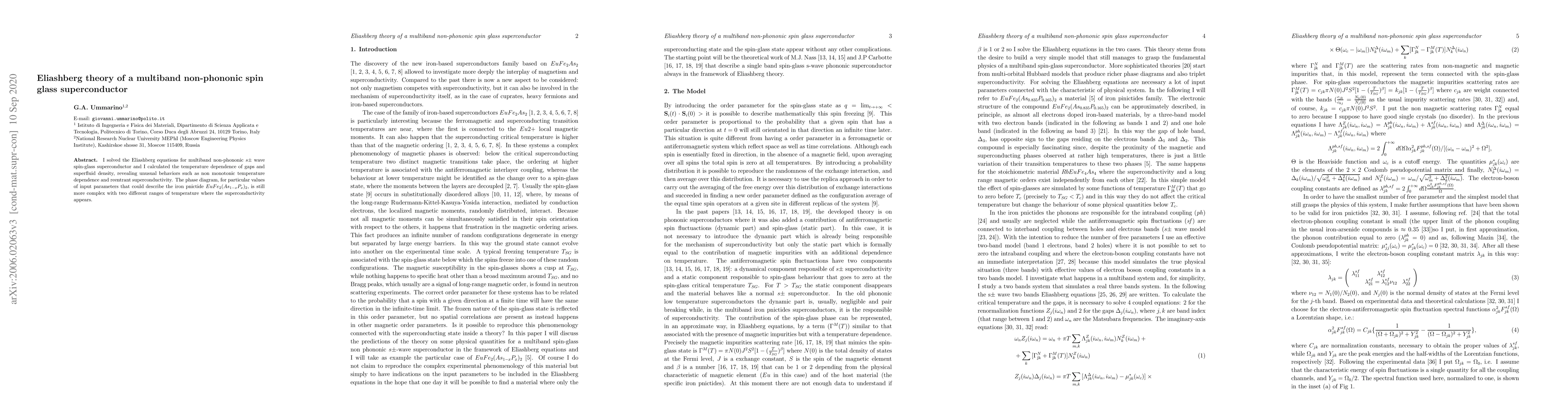 This paper explores the Eliashberg theory for a multiband non-phononic $s\pm$ wave spin glass superconductor, revealing unusual non-monotonic temperature dependence and reentrant superconductivity, with complex phase diagrams showing superconductivity in two distinct temperature ranges for specific parameter values.