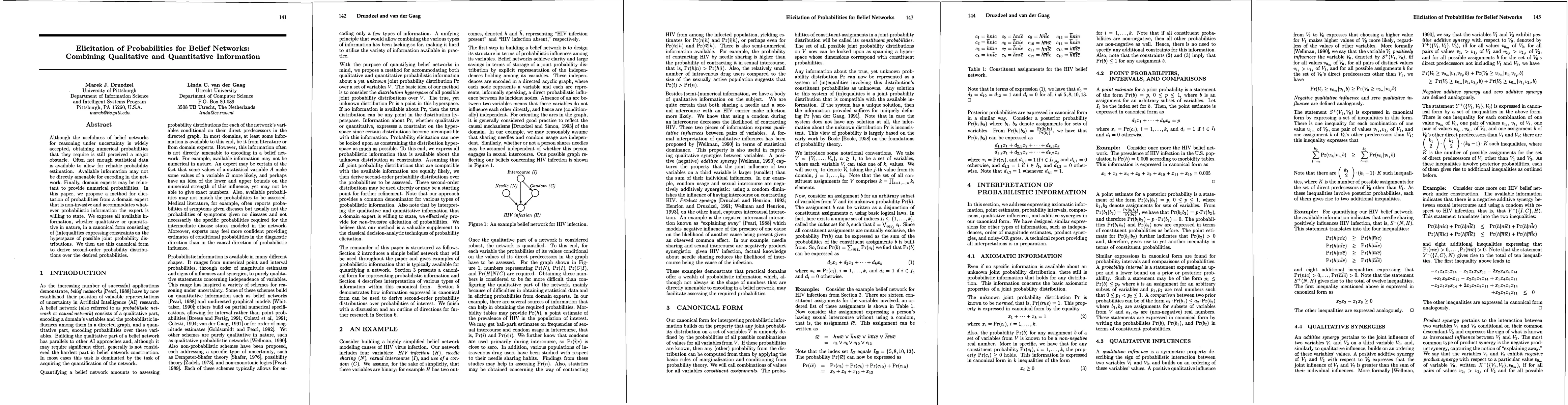This paper proposes a method for eliciting probabilities for belief networks by combining qualitative and quantitative information from domain experts. It uses a canonical form to represent all available information and derives second-order probability distributions to address the challenge of insufficient statistical data.