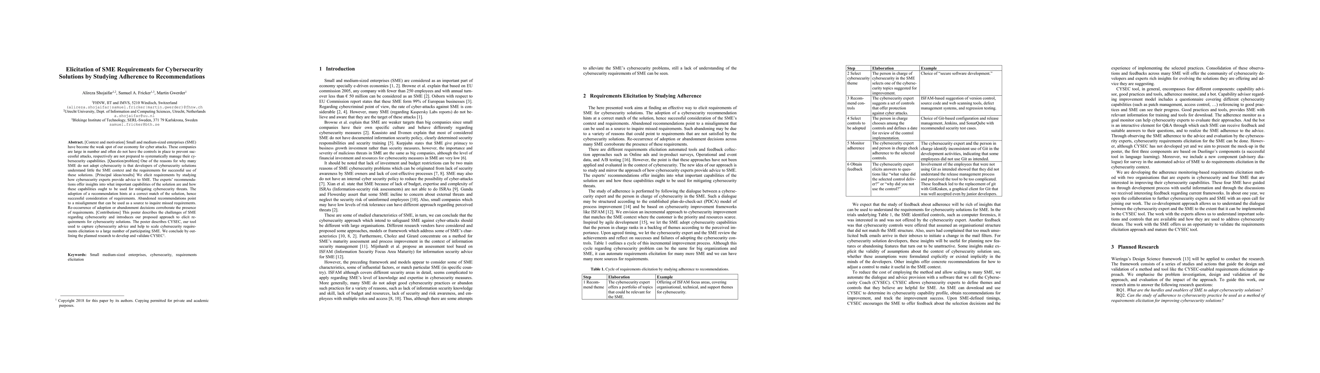 Small and medium-sized enterprises (SME) have become the weak spot of our economy for cyber attacks. These companies are large in number and often do not have the controls in place to prevent successful attacks, respectively are not prepared to systematically manage their cybersecurity capabilities. One of the reasons for why many SME do not adopt cybersecurity is that developers of cybersecurity solutions understand little the SME context and the requirements for successful use of these solutions. We elicit requirements by studying how cybersecurity experts provide advice to SME. The experts recommendations offer insights into what important capabilities of the solution are and how these capabilities ought to be used for mitigating cybersecurity threats. The adoption of a recommendation hints at a correct match of the solution, hence successful consideration of requirements. Abandoned recommendations point to a misalignment that can be used as a source to inquire missed requirements. Re-occurrence of adoption or abandonment decisions corroborate the presence of requirements. This poster describes the challenges of SME regarding cybersecurity and introduces our proposed approach to elicit requirements for cybersecurity solutions. The poster describes CYSEC, our tool used to capture cybersecurity advice and help to scale cybersecurity requirements elicitation to a large number of participating SME. We conclude by outlining the planned research to develop and validate CYSEC.