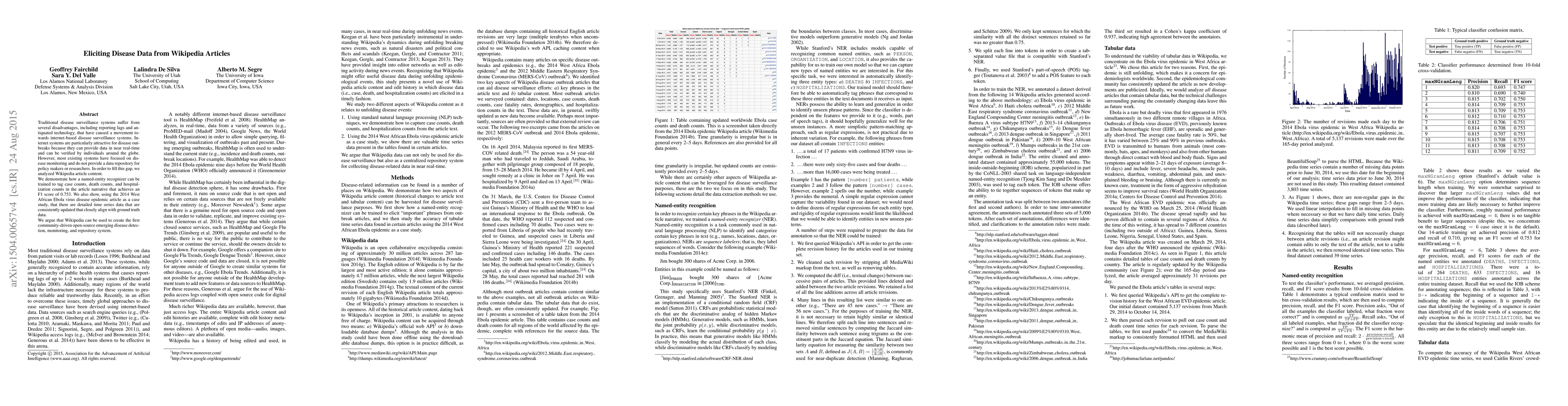This paper explores leveraging Wikipedia articles to create a new disease surveillance system, demonstrating a named-entity recognizer that tags case counts and other metrics with an F1 score of 0.753. The study uses the 2014 Ebola outbreak as a case study to show the potential of Wikipedia as a community-driven, open-source repository for emerging disease data.