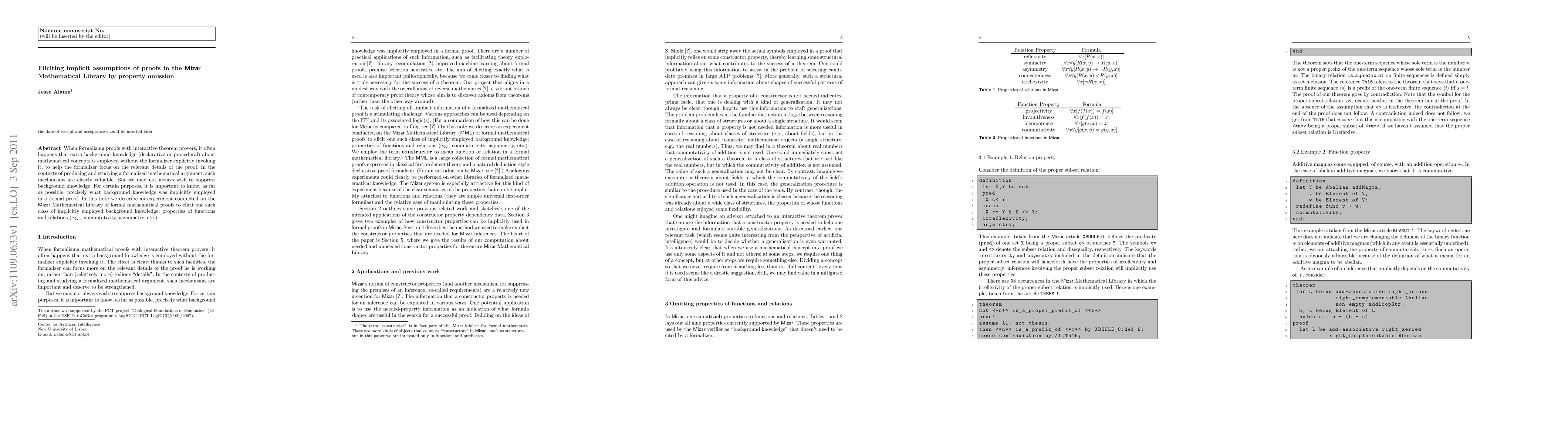 When formalizing proofs with interactive theorem provers, it often happens that extra background knowledge (declarative or procedural) about mathematical concepts is employed without the formalizer explicitly invoking it, to help the formalizer focus on the relevant details of the proof. In the contexts of producing and studying a formalized mathematical argument, such mechanisms are clearly valuable. But we may not always wish to suppress background knowledge. For certain purposes, it is important to know, as far as possible, precisely what background knowledge was implicitly employed in a formal proof. In this note we describe an experiment conducted on the MIZAR Mathematical Library of formal mathematical proofs to elicit one such class of implicitly employed background knowledge: properties of functions and relations (e.g., commutativity, asymmetry, etc.).