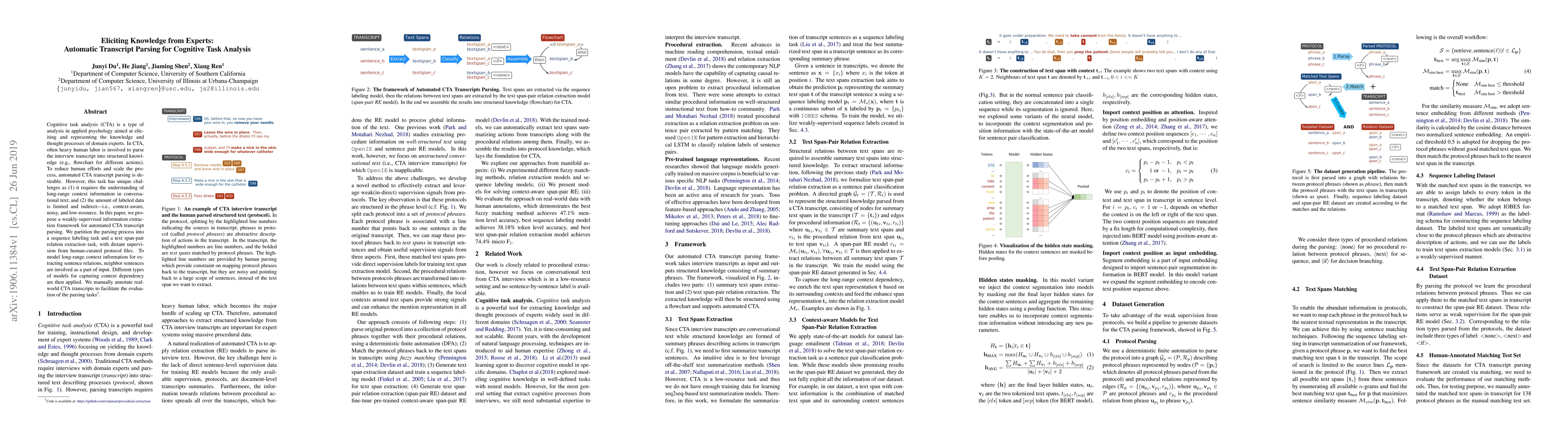 Cognitive task analysis (CTA) is a type of analysis in applied psychology aimed at eliciting and representing the knowledge and thought processes of domain experts. In CTA, often heavy human labor is involved to parse the interview transcript into structured knowledge (e.g., flowchart for different actions). To reduce human efforts and scale the process, automated CTA transcript parsing is desirable. However, this task has unique challenges as (1) it requires the understanding of long-range context information in conversational text; and (2) the amount of labeled data is limited and indirect---i.e., context-aware, noisy, and low-resource. In this paper, we propose a weakly-supervised information extraction framework for automated CTA transcript parsing. We partition the parsing process into a sequence labeling task and a text span-pair relation extraction task, with distant supervision from human-curated protocol files. To model long-range context information for extracting sentence relations, neighbor sentences are involved as a part of input. Different types of models for capturing context dependency are then applied. We manually annotate real-world CTA transcripts to facilitate the evaluation of the parsing tasks