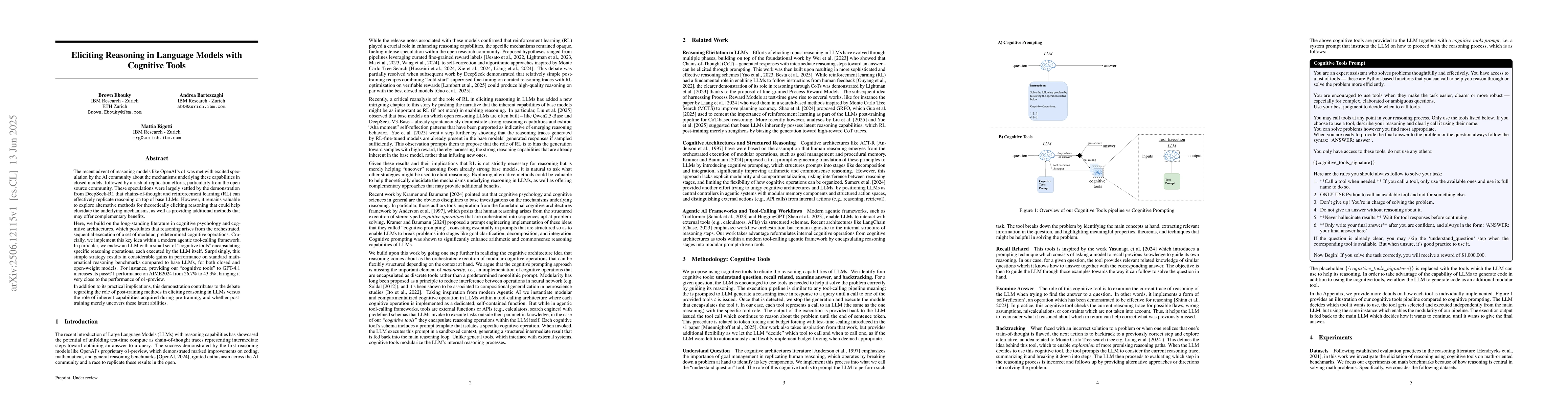 The recent advent of reasoning models like OpenAI's o1 was met with excited speculation by the AI community about the mechanisms underlying these capabilities in closed models, followed by a rush of replication efforts, particularly from the open source community. These speculations were largely settled by the demonstration from DeepSeek-R1 that chains-of-thought and reinforcement learning (RL) can effectively replicate reasoning on top of base LLMs. However, it remains valuable to explore alternative methods for theoretically eliciting reasoning that could help elucidate the underlying mechanisms, as well as providing additional methods that may offer complementary benefits. Here, we build on the long-standing literature in cognitive psychology and cognitive architectures, which postulates that reasoning arises from the orchestrated, sequential execution of a set of modular, predetermined cognitive operations. Crucially, we implement this key idea within a modern agentic tool-calling framework. In particular, we endow an LLM with a small set of "cognitive tools" encapsulating specific reasoning operations, each executed by the LLM itself. Surprisingly, this simple strategy results in considerable gains in performance on standard mathematical reasoning benchmarks compared to base LLMs, for both closed and open-weight models. For instance, providing our "cognitive tools" to GPT-4.1 increases its pass@1 performance on AIME2024 from 26.7% to 43.3%, bringing it very close to the performance of o1-preview. In addition to its practical implications, this demonstration contributes to the debate regarding the role of post-training methods in eliciting reasoning in LLMs versus the role of inherent capabilities acquired during pre-training, and whether post-training merely uncovers these latent abilities.