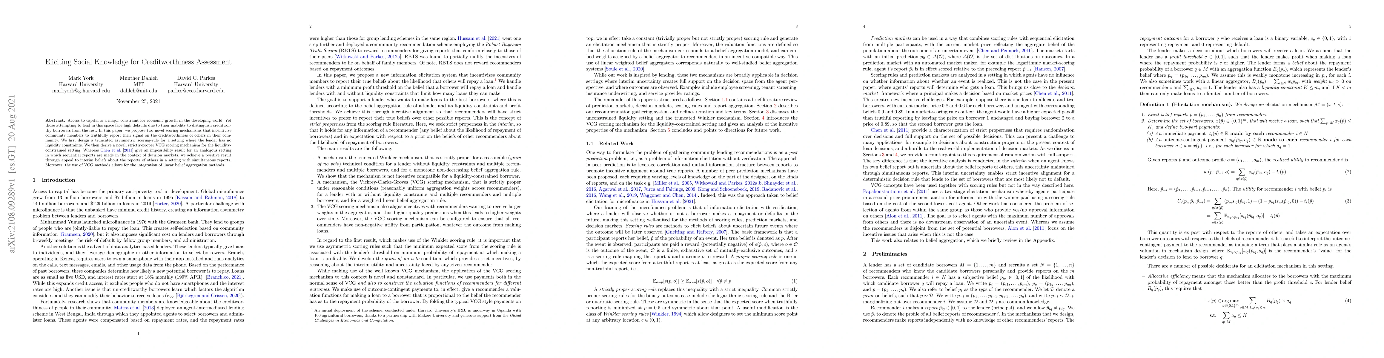 Access to capital is a major constraint for economic growth in the developing world. Yet those attempting to lend in this space face high defaults due to their inability to distinguish creditworthy borrowers from the rest. In this paper, we propose two novel scoring mechanisms that incentivize community members to truthfully report their signal on the creditworthiness of others in their community. We first design a truncated asymmetric scoring-rule for a setting where the lender has no liquidity constraints. We then derive a novel, strictly-proper VCG scoring mechanism for the liquidity-constrained setting. Whereas Chen et al. [2011] give an impossibility result for an analogous setting in which sequential reports are made in the context of decision markets, we achieve a positive result through appeal to interim beliefs about the reports of others in a setting with simultaneous reports.Moreover, the use of VCG methods allows for the integration of linear belief aggregation methods.