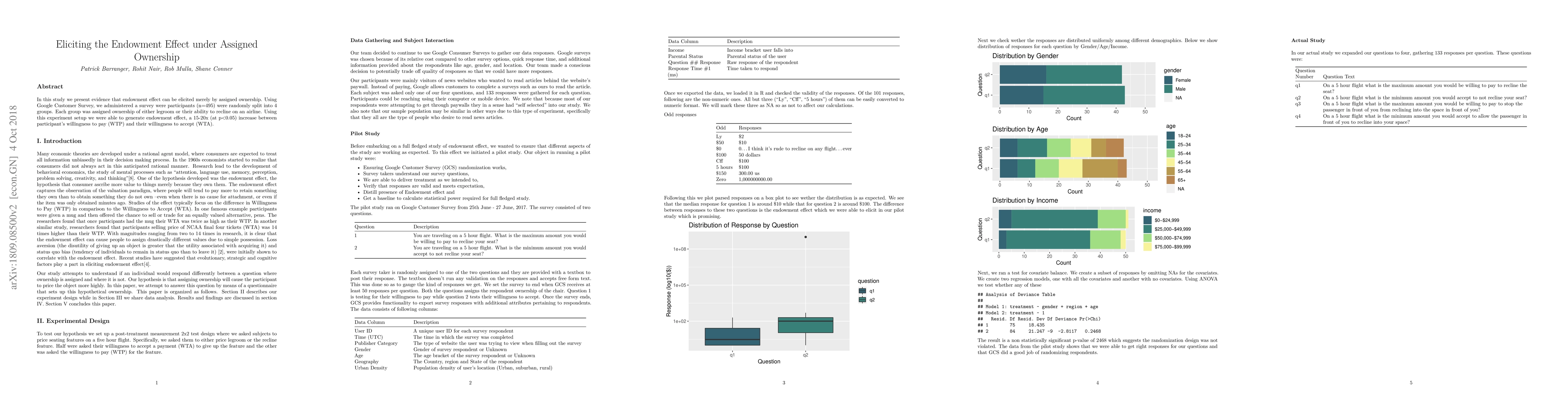 In this study we present evidence that endowment effect can be elicited merely by assigned ownership. Using Google Customer Survey, we administered a survey were participants (n=495) were randomly split into 4 groups. Each group was assigned ownership of either legroom or their ability to recline on an airline. Using this experiment setup we were able to generate endowment effect, a 15-20x (at p<0.05) increase between participant's willingness to pay (WTP) and their willingness to accept (WTA).