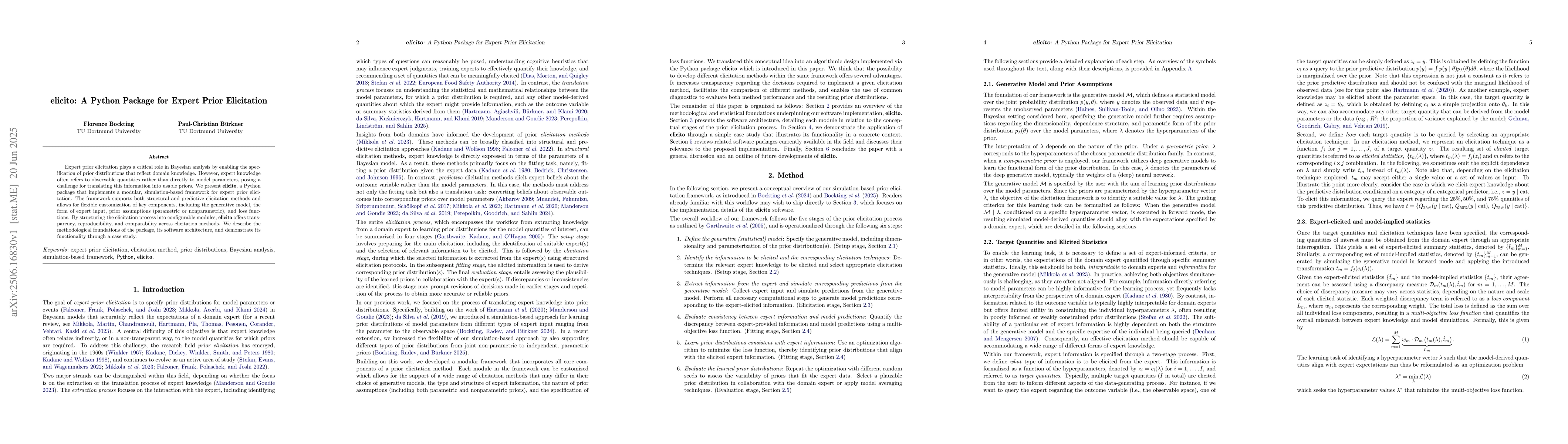 Expert prior elicitation plays a critical role in Bayesian analysis by enabling the specification of prior distributions that reflect domain knowledge. However, expert knowledge often refers to observable quantities rather than directly to model parameters, posing a challenge for translating this information into usable priors. We present elicito, a Python package that implements a modular, simulation-based framework for expert prior elicitation. The framework supports both structural and predictive elicitation methods and allows for flexible customization of key components, including the generative model, the form of expert input, prior assumptions (parametric or nonparametric), and loss functions. By structuring the elicitation process into configurable modules, elicito offers transparency, reproducibility, and comparability across elicitation methods. We describe the methodological foundations of the package, its software architecture, and demonstrate its functionality through a case study.