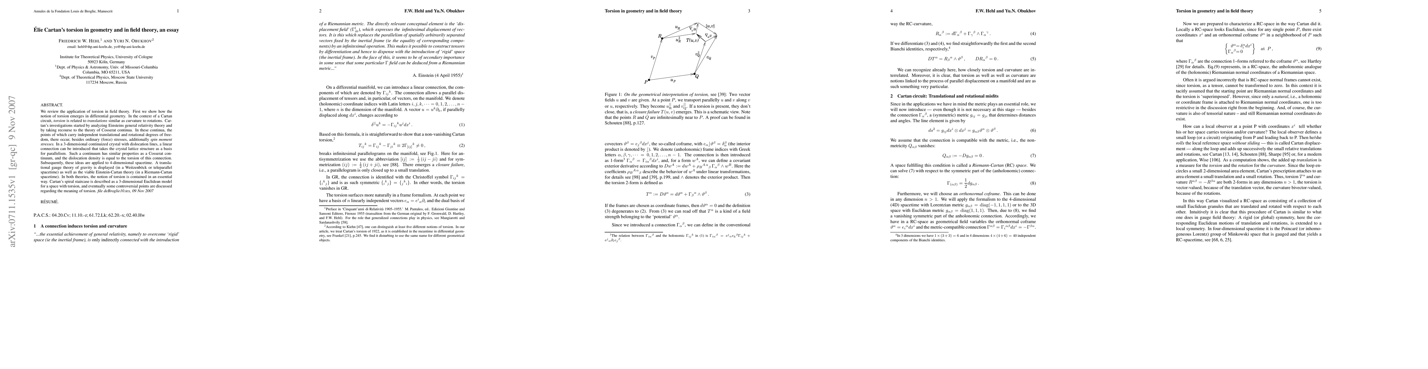 We review the application of torsion in field theory. First we show how the notion of torsion emerges in differential geometry. In the context of a Cartan circuit, torsion is related to translations similar as curvature to rotations. Cartan's investigations started by analyzing Einsteins general relativity theory and by taking recourse to the theory of Cosserat continua. In these continua, the points of which carry independent translational and rotational degrees of freedom, there occur, besides ordinary (force) stresses, additionally spin moment stresses. In a 3-dimensional continuized crystal with dislocation lines, a linear connection can be introduced that takes the crystal lattice structure as a basis for parallelism. Such a continuum has similar properties as a Cosserat continuum, and the dislocation density is equal to the torsion of this connection. Subsequently, these ideas are applied to 4-dimensional spacetime. A translational gauge theory of gravity is displayed (in a Weitzenboeck or teleparallel spacetime) as well as the viable Einstein-Cartan theory (in a Riemann-Cartan spacetime). In both theories, the notion of torsion is contained in an essential way. Cartan's spiral staircase is described as a 3-dimensional Euclidean model for a space with torsion, and eventually some controversial points are discussed regarding the meaning of torsion.