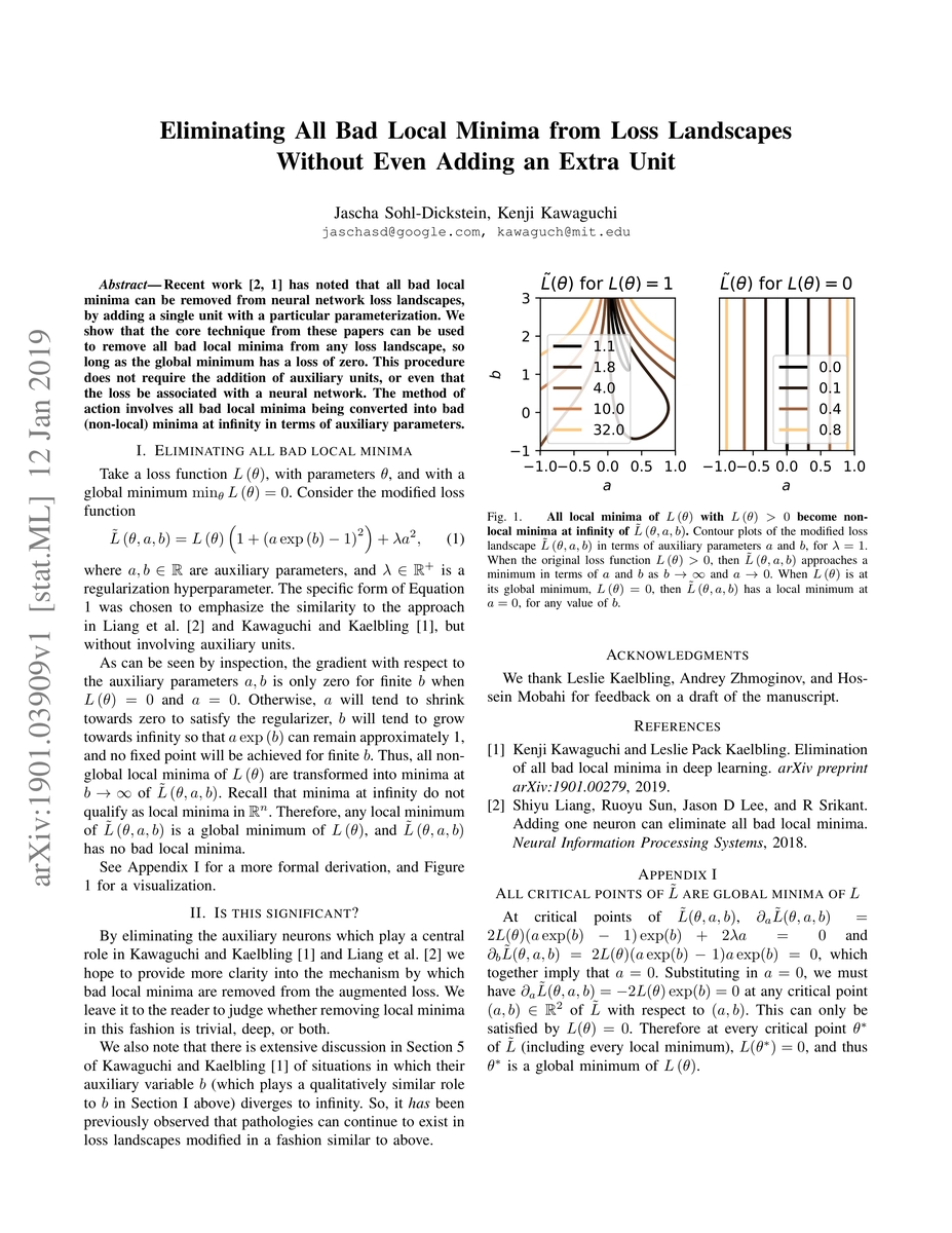 Summary: This paper demonstrates that all bad local minima in loss landscapes can be eliminated without adding auxiliary units, by converting them into non-local minima at infinity using a specific parameterization technique, applicable to any loss landscape where the global minimum has a loss of zero. This method does not require neural networks or additional units.