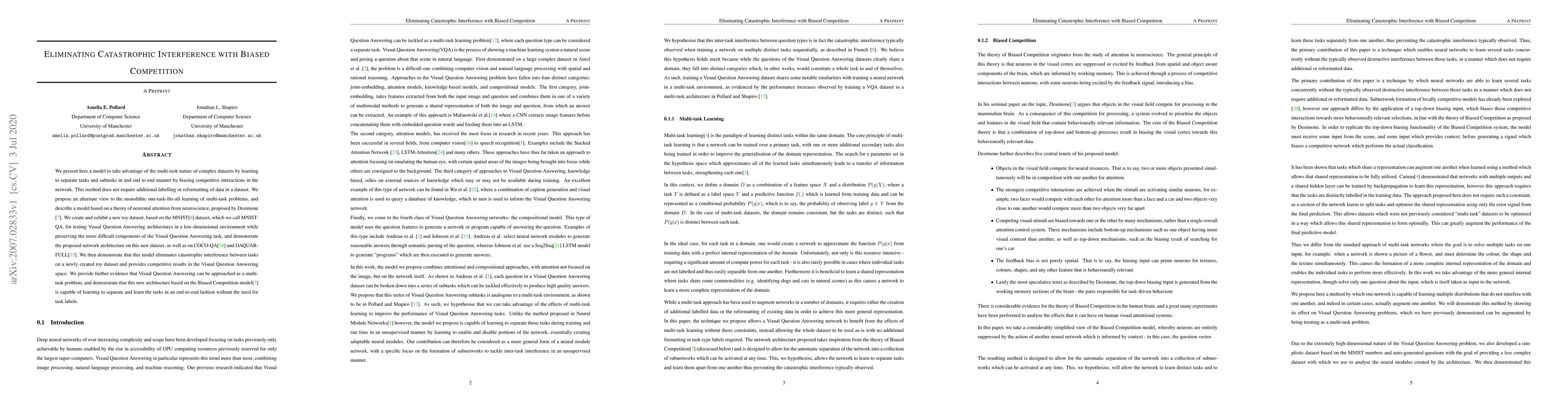 We present here a model to take advantage of the multi-task nature of complex datasets by learning to separate tasks and subtasks in and end to end manner by biasing competitive interactions in the network. This method does not require additional labelling or reformatting of data in a dataset. We propose an alternate view to the monolithic one-task-fits-all learning of multi-task problems, and describe a model based on a theory of neuronal attention from neuroscience, proposed by Desimone. We create and exhibit a new toy dataset, based on the MNIST dataset, which we call MNIST-QA, for testing Visual Question Answering architectures in a low-dimensional environment while preserving the more difficult components of the Visual Question Answering task, and demonstrate the proposed network architecture on this new dataset, as well as on COCO-QA and DAQUAR-FULL. We then demonstrate that this model eliminates catastrophic interference between tasks on a newly created toy dataset and provides competitive results in the Visual Question Answering space. We provide further evidence that Visual Question Answering can be approached as a multi-task problem, and demonstrate that this new architecture based on the Biased Competition model is capable of learning to separate and learn the tasks in an end-to-end fashion without the need for task labels.